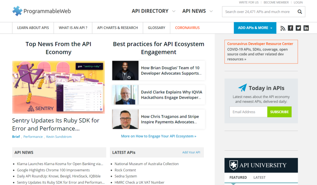 Una delle principali fonti di notizie e informazioni sulle API, che segue lo sviluppo di questo settore in tutto il mondo e fornisce l’elenco delle API del web.