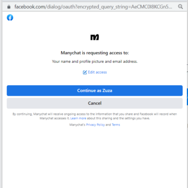 Manychat ha richiesto l’accesso a una serie di dettagli diversi su di me e sulle pagine che possiedo, come il nome, l’immagine del profilo, l’indirizzo e-mail, la gestione e l’accesso alle pagine e altro ancora. Non ho avuto altra scelta se non quella di accettare e quindi ho potuto andare avanti.
