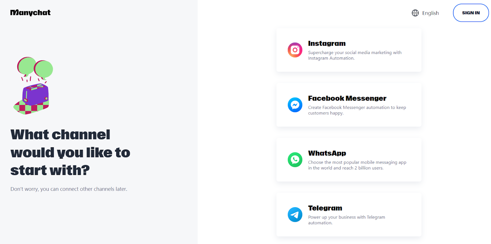 Per me, il processo di installazione di Manychat è iniziato visitando il sito web di Manychat e cliccando sul pulsante “Inizia Gratuitamente“. Da lì mi è stato chiesto di scegliere uno dei 4 canali disponibili: Instagram, Facebook, Telegram e WhatsApp. Poiché volevo testare il chatbot su Facebook Messenger, ho fatto clic su questa opzione e ho proceduto all’accesso utilizzando il mio account Facebook, come richiesto.