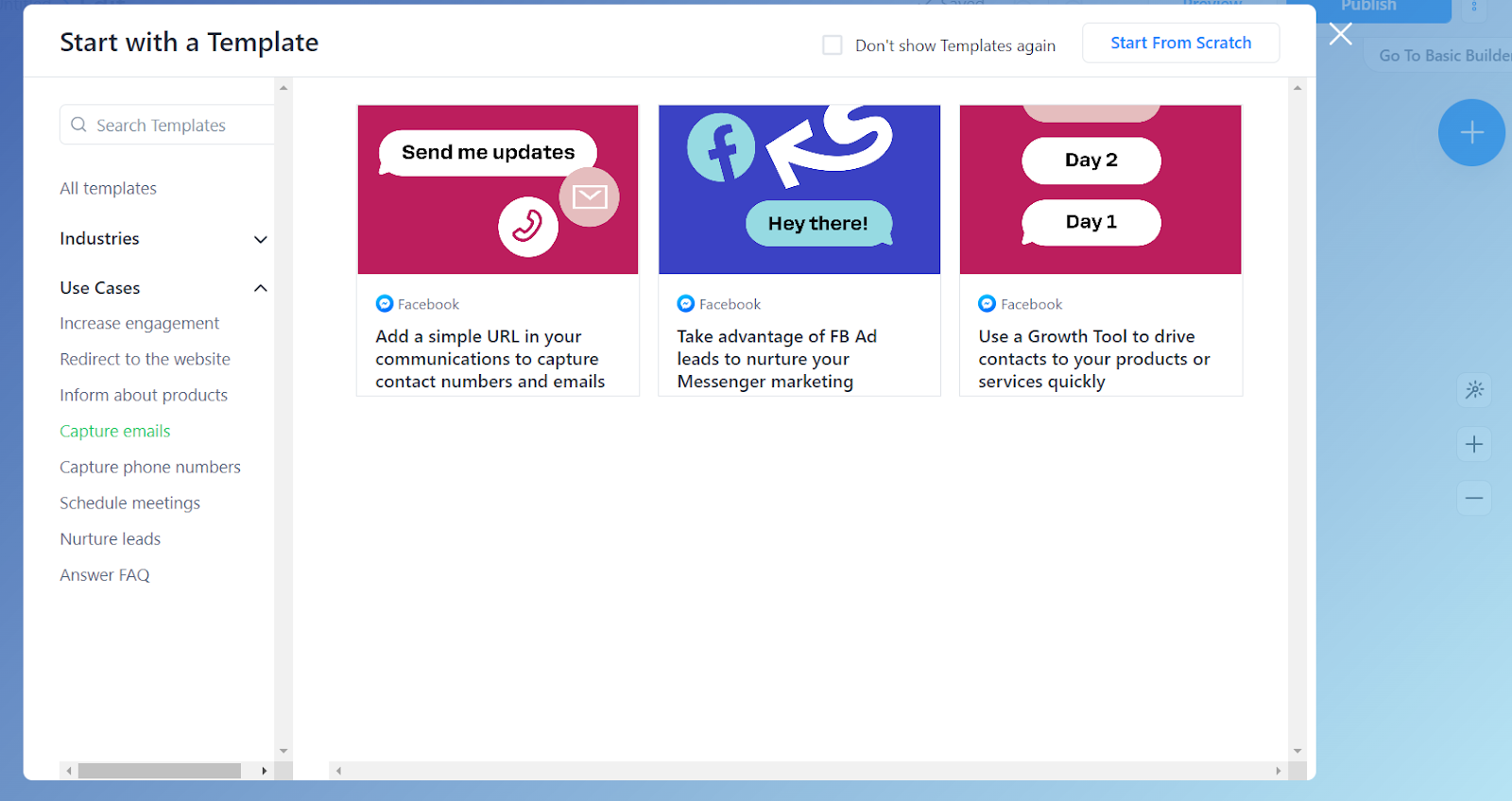 Ho apprezzato in particolare le seguenti funzionalità: impostazione delle parole chiave, strumenti di crescita e editor drag-and-drop. Sono disponibili anche molti modelli e sequenze di automazione precostituiti che ho trovato utili per iniziare rapidamente. I miei esempi preferiti includono casi d’uso come “aumentare il coinvolgimento”, “catturare numeri di telefono” e “informare sui prodotti”.