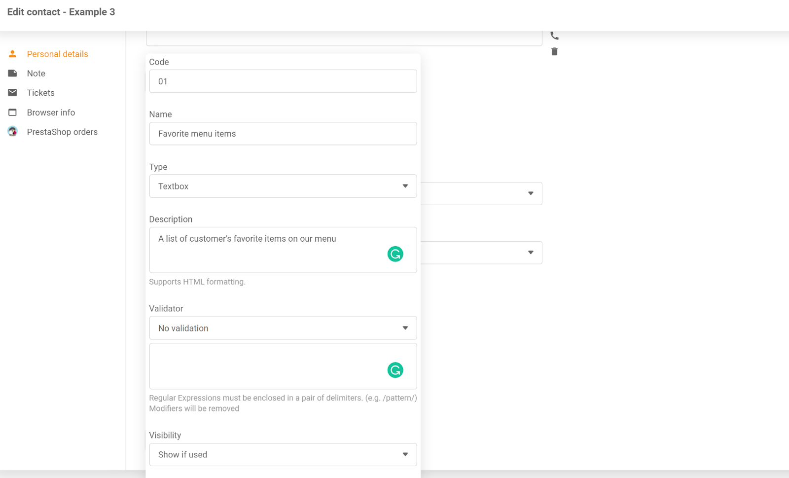 Una delle migliori opzioni di personalizzazione per i contatti e le aziende sono i campi personalizzati. Questa funzionalità permette a ogni utente di personalizzare la propria esperienza di contatto. Puoi aggiungere una serie di campi personalizzati, assegnare loro un nome e inserire le informazioni necessarie. Questa funzionalità è utile per ogni tipo di azienda, perché permette di segmentare i clienti in base a criteri selezionati dall’utente stesso. Che si tratti di informazioni generali come i dati del Paese o il numero di scarpe del cliente, puoi memorizzarle nelle informazioni di contatto. Puoi personalizzare il campo in modo che funzioni come casella di controllo, campo di testo, elenco e altro ancora. LiveAgent consente anche di impostare la visibilità di questi dati.