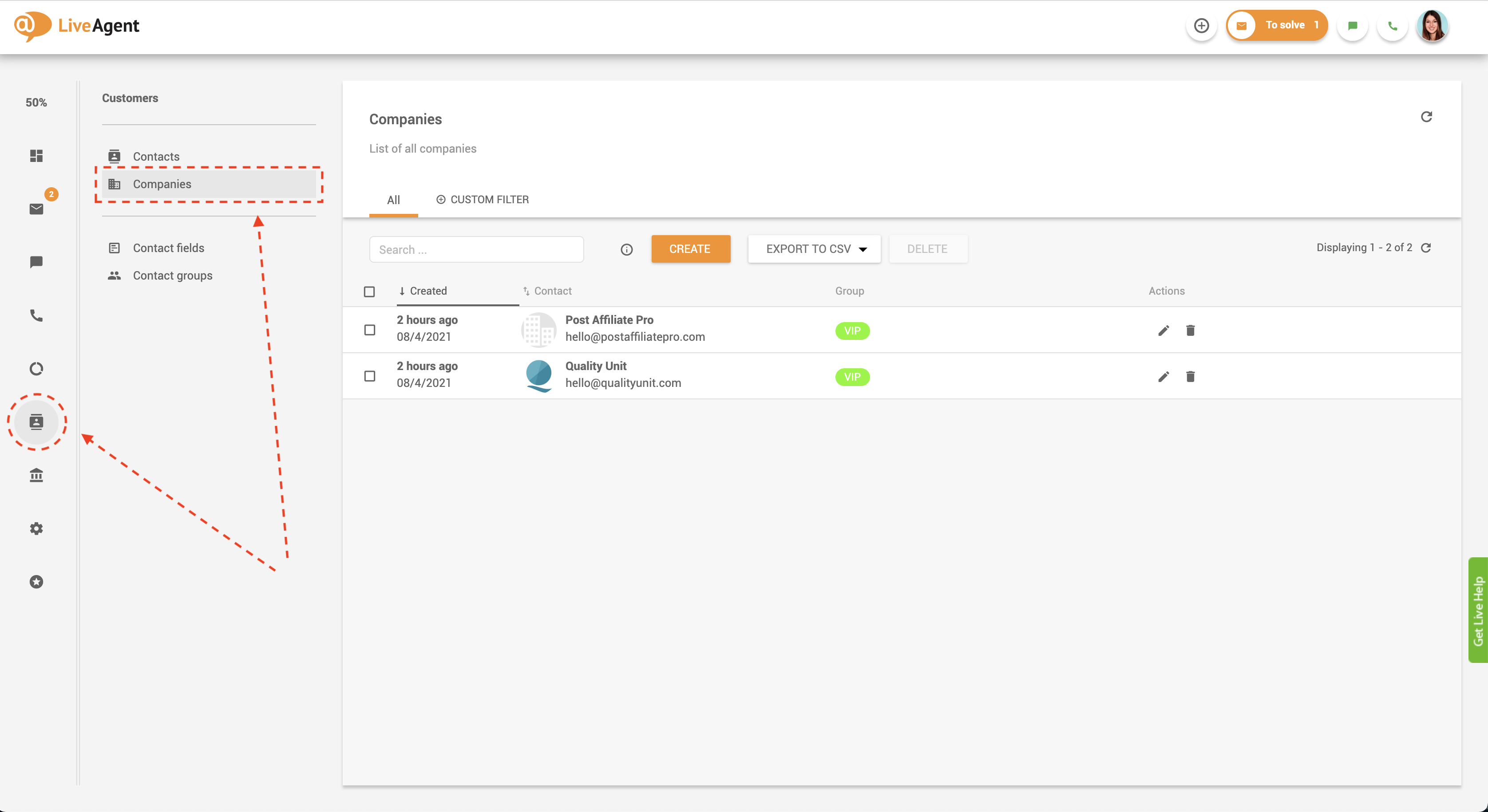 LiveAgent è in grado di raccogliere e memorizzare informazioni su varie aziende con cui si potrebbe entrare in contatto. L’interfaccia utente funziona esattamente come nella sezione contatti, con lo stesso tipo di informazioni disponibili. Puoi accedere facilmente alle informazioni sulle aziende in qualsiasi momento e modificarle in base alle proprie preferenze.