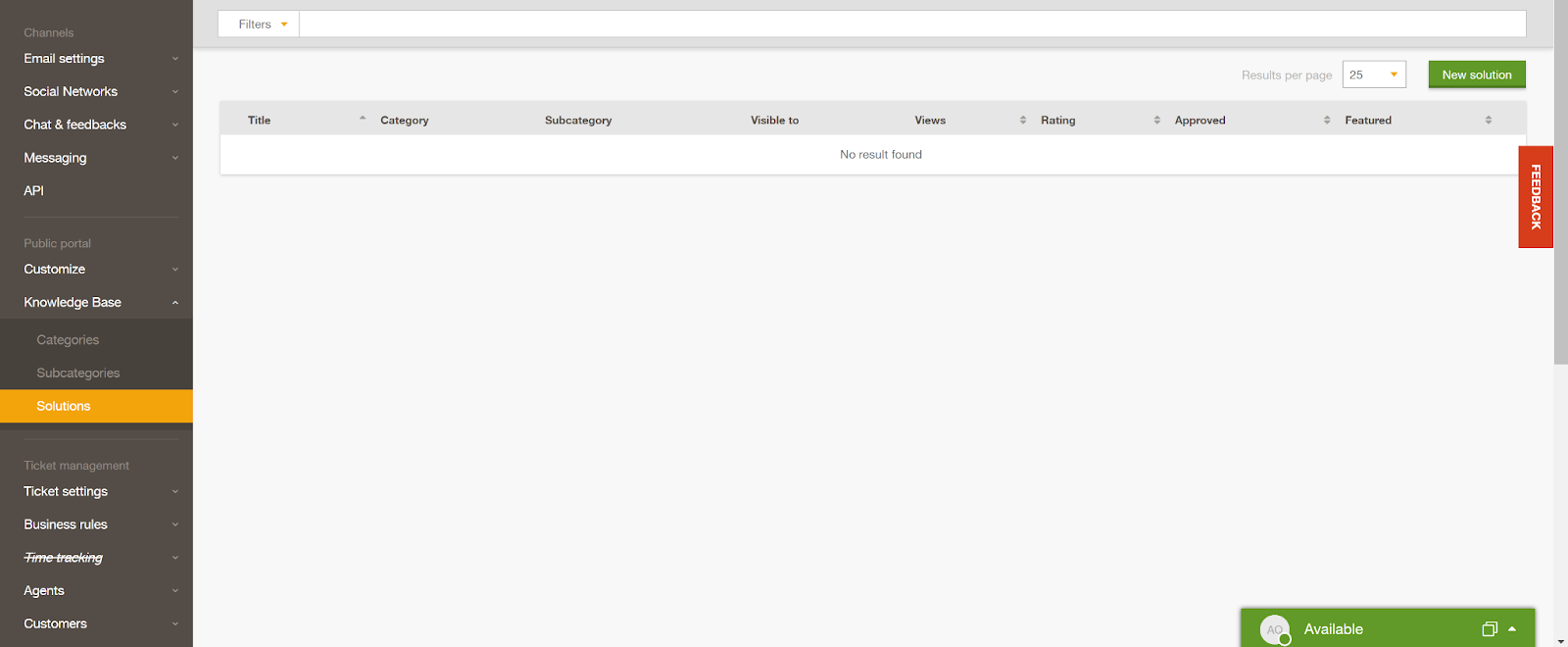 Una volta entrato nella base di conoscenza, vedrai una schermata che ti inviterà a creare nuove categorie o sottocategorie, ma nessuna opzione per creare un nuovo articolo. Questa opzione è disponibile sotto la voce di menu Soluzioni nel pannello di sinistra. Facendo clic su di essa, vedrai il pulsante per la creazione di un nuovo articolo nell’angolo in alto a destra dell’interfaccia della base di conoscenze.