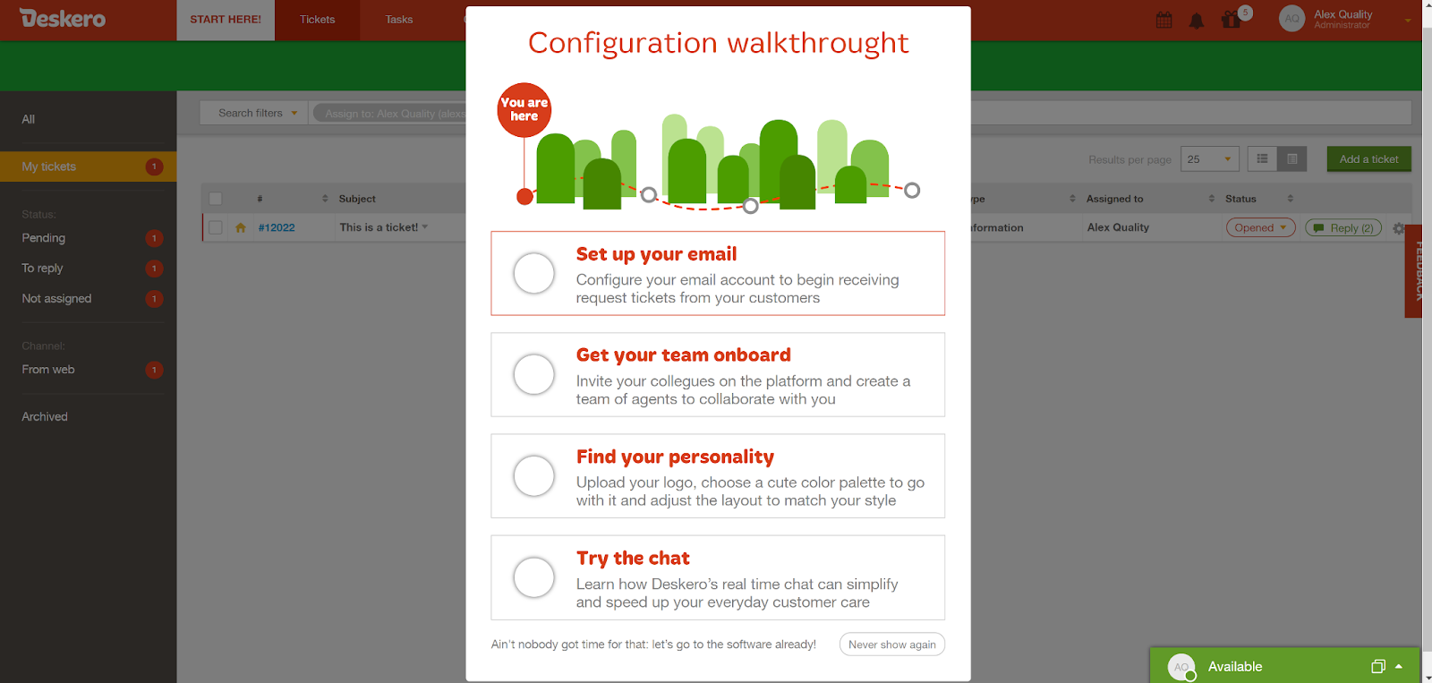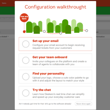 Deskero è una delle poche soluzioni che non ti obbliga a fare una demo; puoi semplicemente iniziare con una prova gratuita senza bisogno di fornire informazioni sulla carta di credito. È anche molto veloce, quindi puoi registrarti e inserire la tua nuova dashboard in un paio di minuti. Deskero ti aiuta a configurarti con una breve ma utilissima guida all’inizio del tuo percorso. Al termine, ti troverai nella dashboard principale e potrai iniziare a esplorarla.