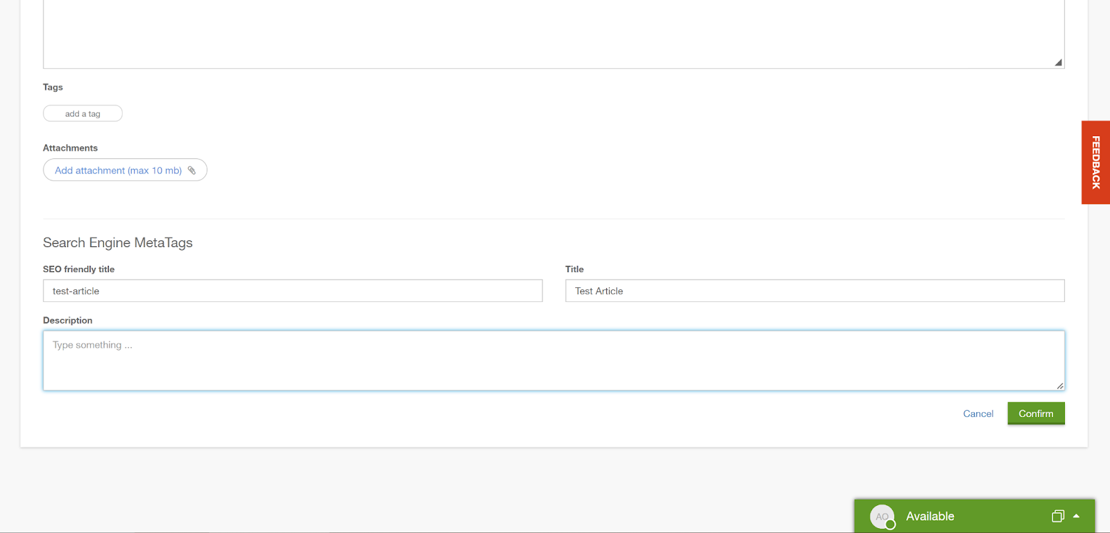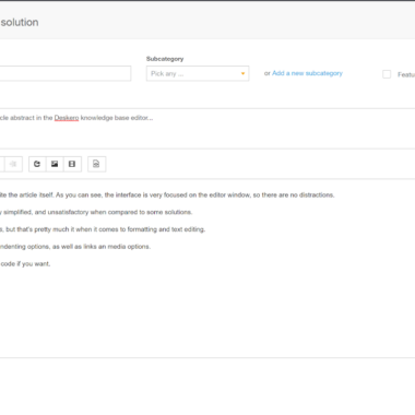 Una volta fatto clic sul pulsante “Nuova soluzione“, puoi iniziare a scrivere nell’editor di articoli. Sono lieto di dire che l’editor di articoli è estremamente ben progettato. Come ogni buon editor di articoli, l’editor di articoli di Deskero porta l’attenzione sulla scrittura, invece di spostarla altrove. I campi per i titoli, l’abstract e il corpo dell’articolo sono ampi e occupano la maggior parte dello spazio. Non ci sono elementi di distrazione e ci si può concentrare sulla scrittura.