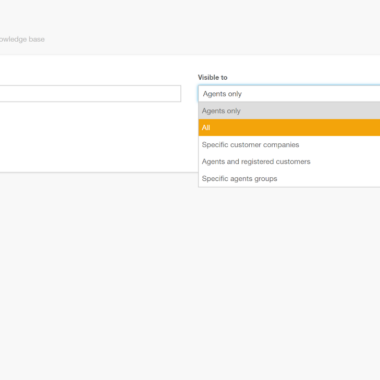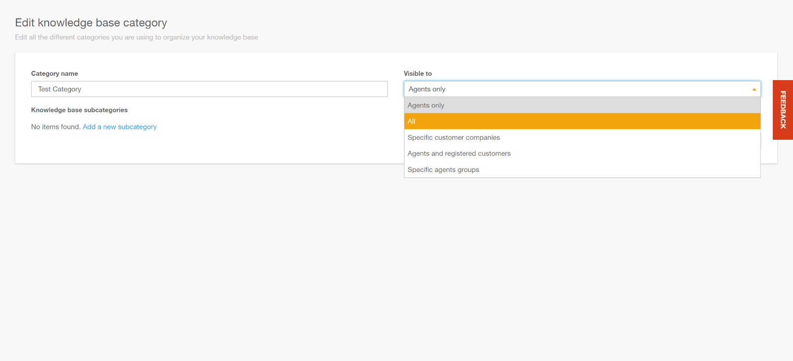 L’interfaccia invita a creare prima delle categorie e delle sottocategorie, il che rivela che Deskero offre alcune buone opzioni di organizzazione per gli articoli. Quando si creano nuove categorie, è possibile scegliere il nome della categoria e le opzioni di visibilità: si può scegliere se una categoria sarà visibile internamente dagli agenti, esternamente dai clienti, visibile da agenti e clienti o visibile solo da alcuni gruppi di agenti.