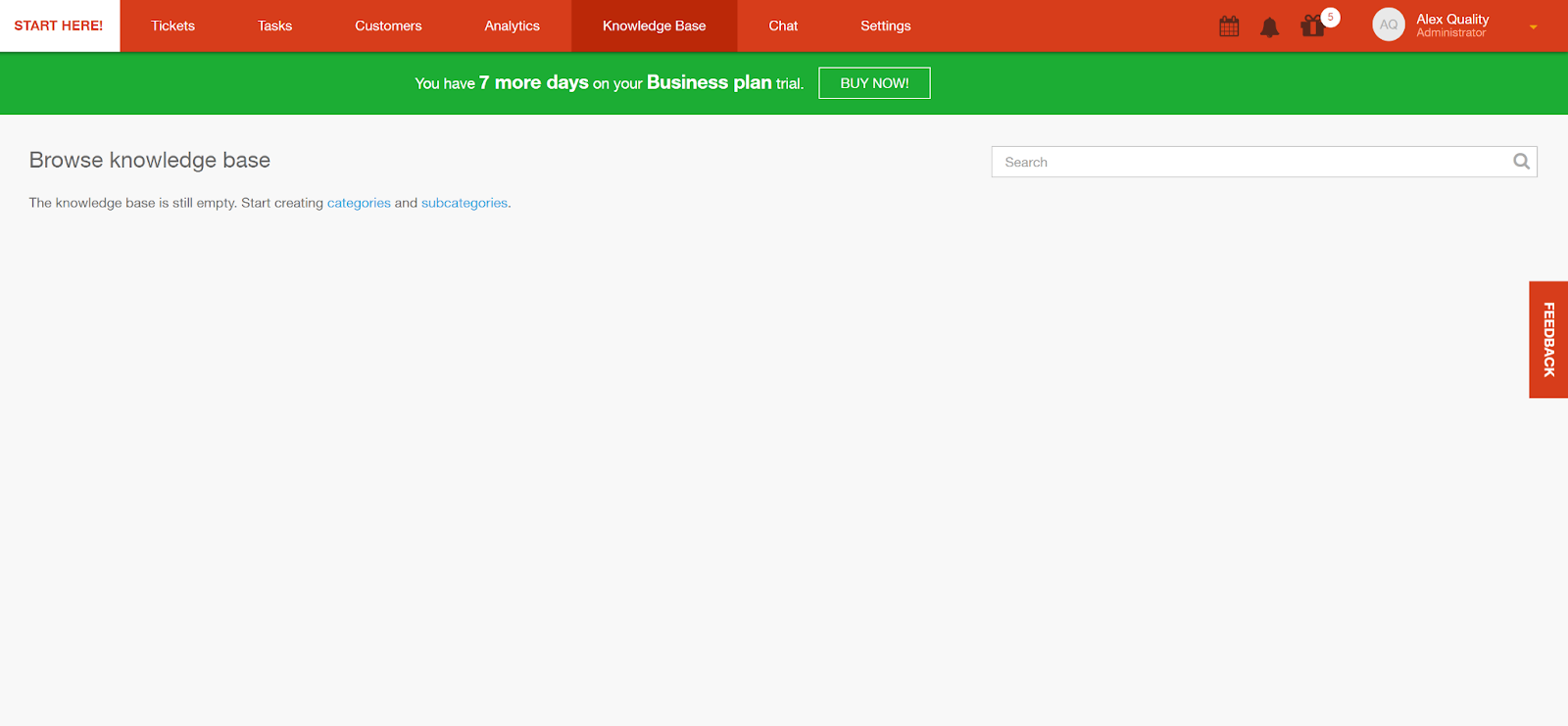 La parte superiore dell’interfaccia mostra una semplice barra dei menu che consente di accedere a vari strumenti e sezioni di Deskero. Ci sono ticket, attività, clienti, analytics, chat, impostazioni e la base di conoscenze. Ciò significa che non è necessario effettuare noiose ricerche all’interno dell’intero software per trovarle, il che è sempre apprezzato, anche se dovrebbe essere una cosa standard. Ogni sezione di questo menu è accompagnata da una barra di menu secondaria sul lato sinistro che consente di eseguire azioni e di accedere alle sottosezioni. Facendo clic sull’opzione della base di conoscenza, si accede a una base di conoscenza fresca e vuota che presenta un’interfaccia semplice.