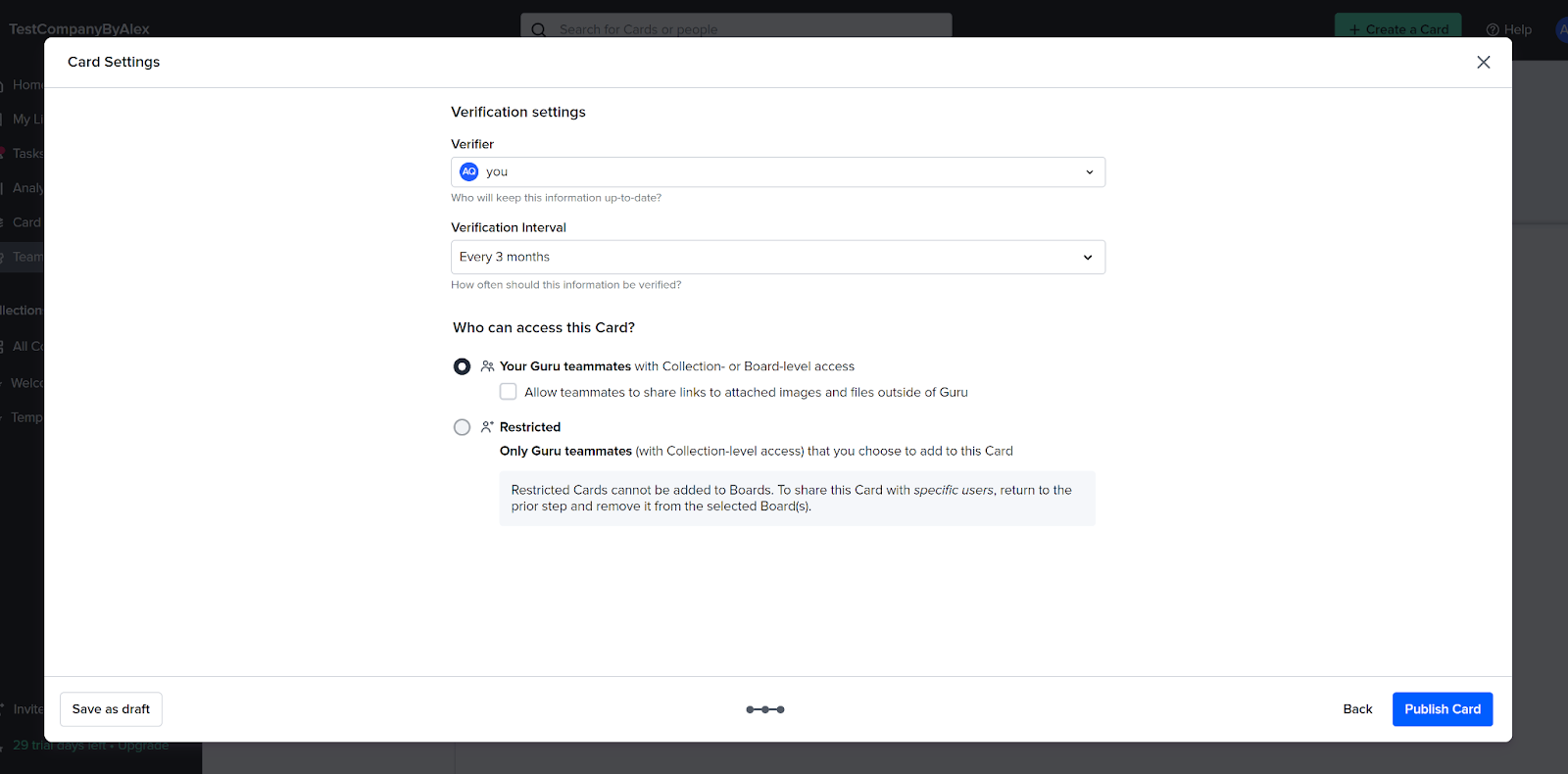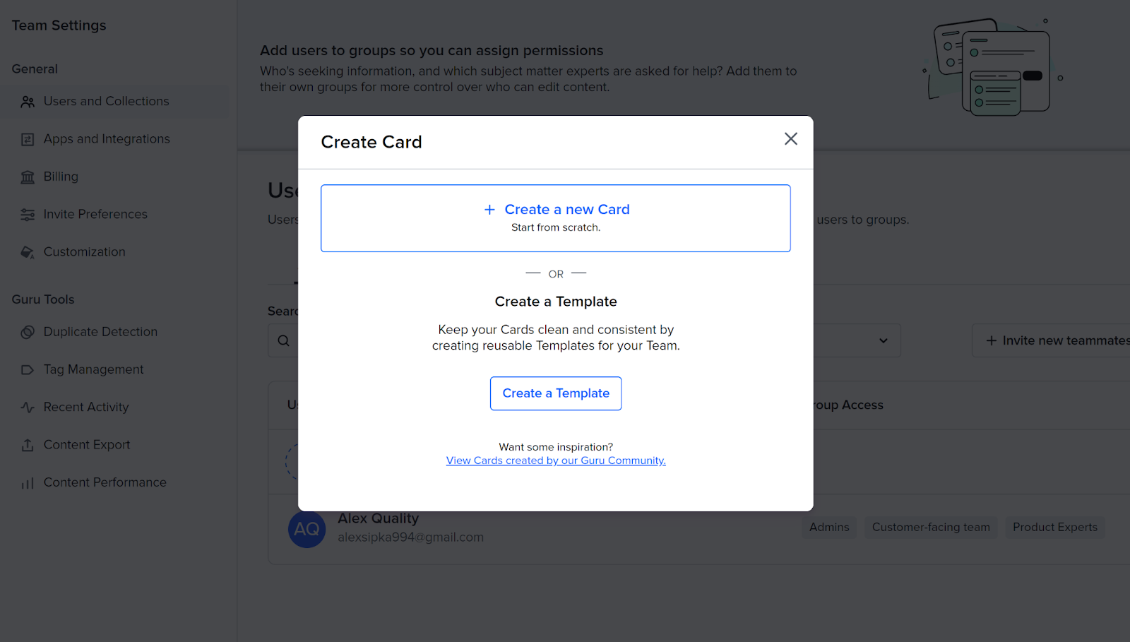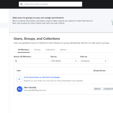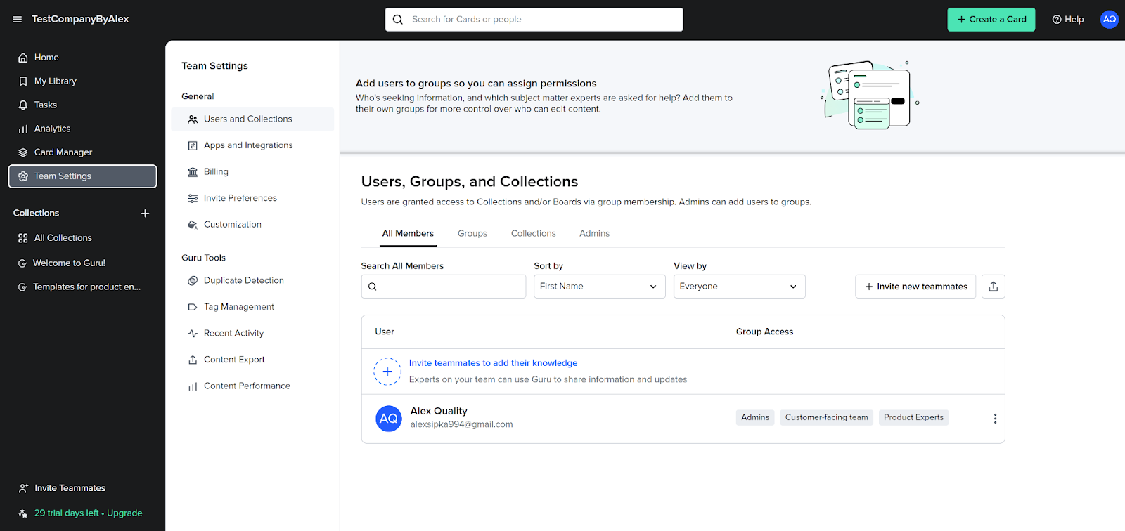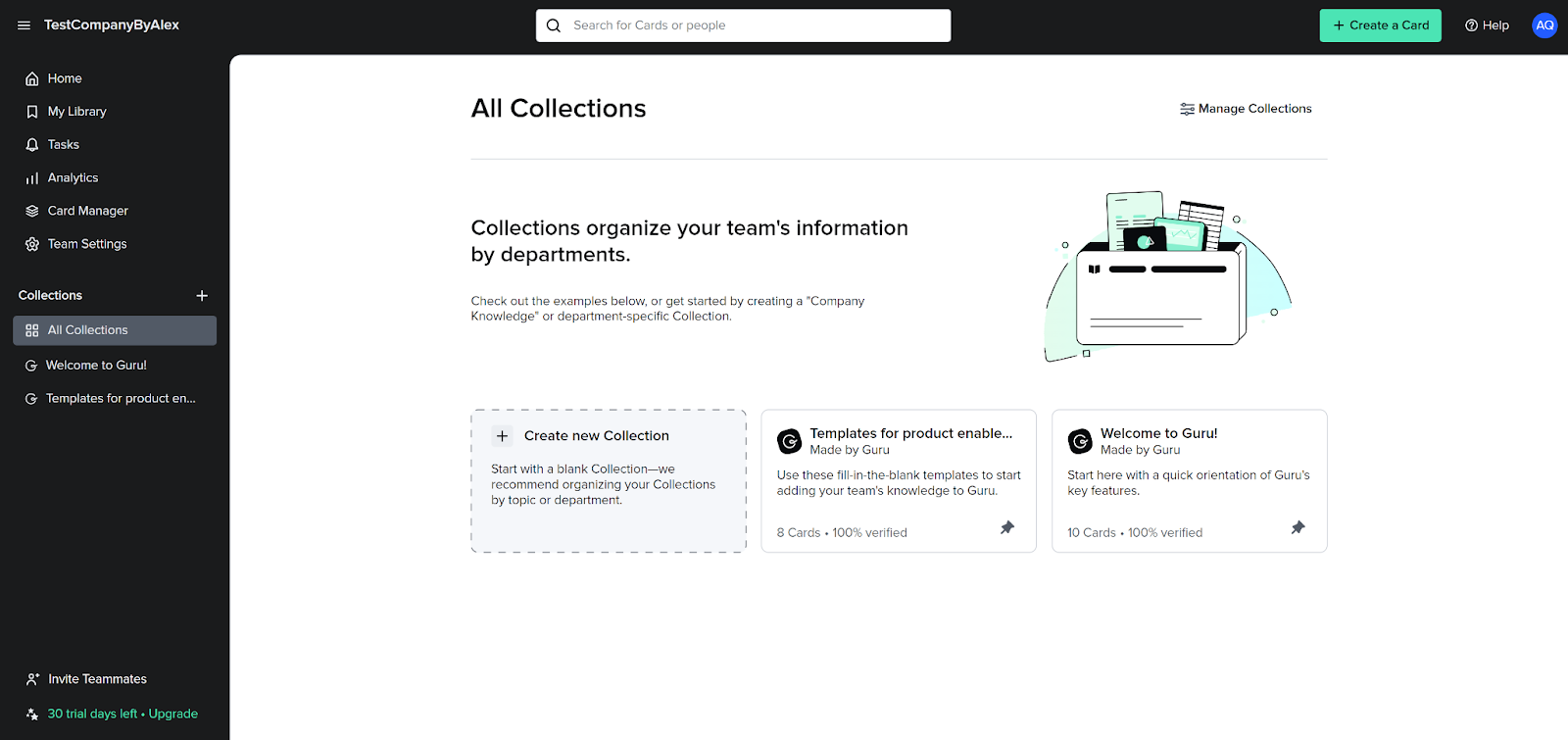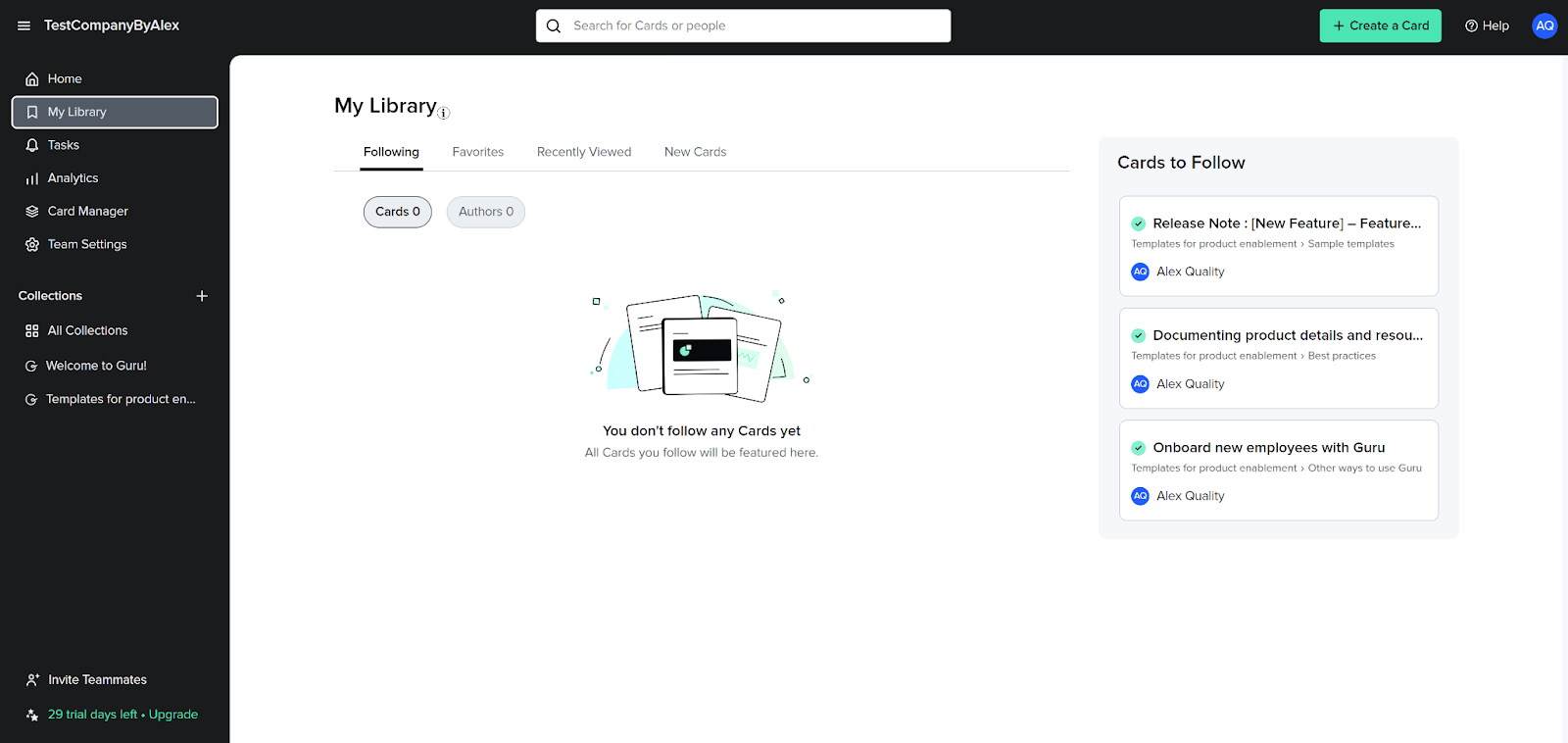 Le opzioni del menu includono la schermata iniziale, la libreria, le attività, le analisi, il gestore delle schede, le impostazioni del team e le collezioni. Se vuoi accedere alle impostazioni, puoi fare clic sull’icona del tuo profilo nell’angolo in alto a destra e regolare la tua esperienza con Guru, se lo desideri. L’interfaccia offre anche delle pratiche schede, che di solito contengono dettagli sugli ultimi aggiornamenti di Guru o utili guide che spiegano alcune funzionalità.