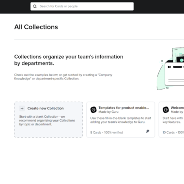 Gli articoli finiti si trovano nel menu Collezioni. Tutte le raccolte create sono ben classificate per facilitare la ricerca. È possibile modificare gli articoli in qualsiasi momento e copiare facilmente un link a qualsiasi articolo. Nel complesso, il software Guru per la base di conoscenza offre funzionalità sorprendenti e un’eccezionale facilità d’uso.