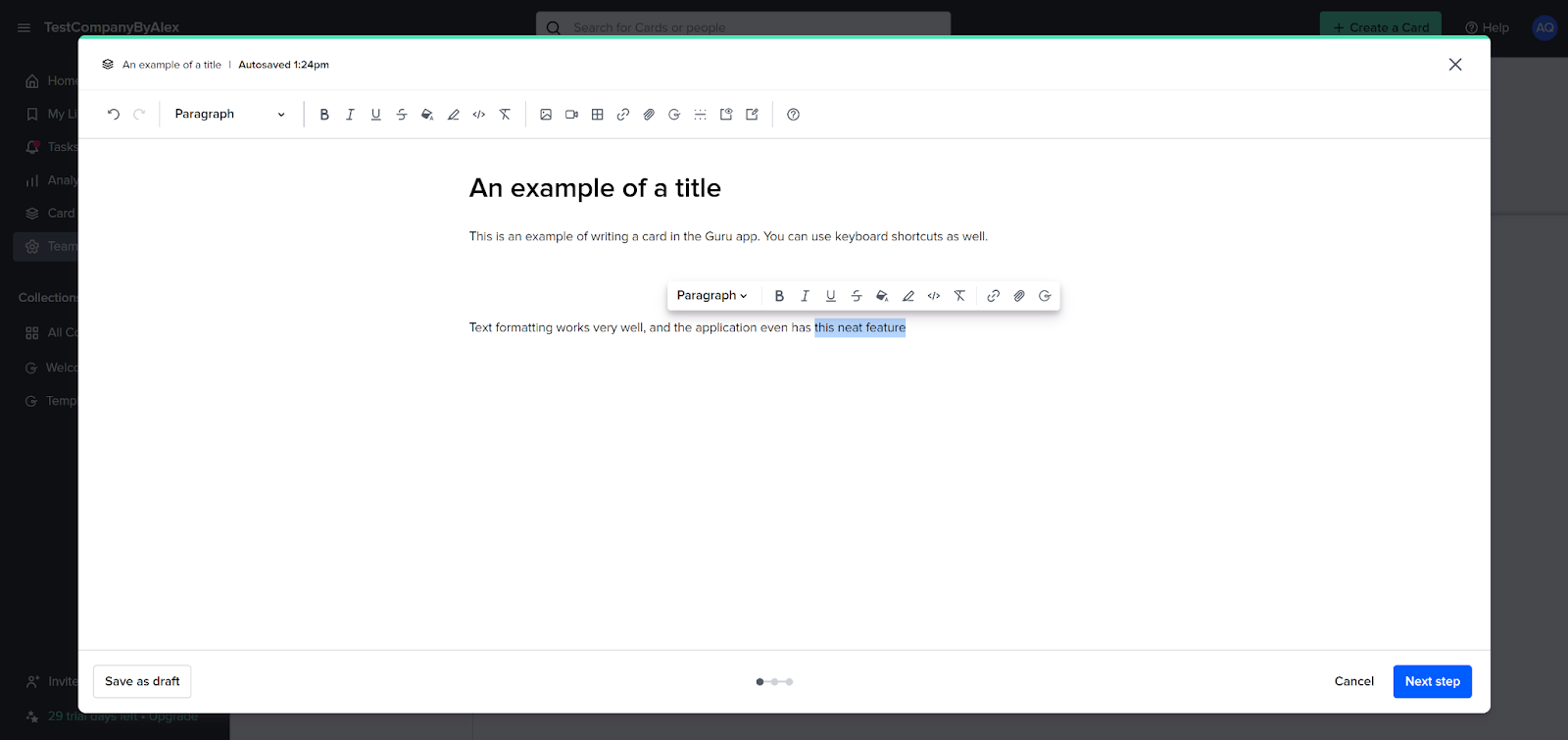 Una volta cliccato su una delle due opzioni, accedi all’editor di articoli di Guru. L’aspetto è molto gradevole, con una grande attenzione alla sezione di scrittura vuota e una barra degli strumenti non intrusiva posta nella parte superiore dell’interfaccia. Le opzioni di formattazione del testo sono ottime, non sono né troppe né troppo poche, creando un buon equilibrio. L’editor di testo supporta anche le scorciatoie da tastiera ed è possibile richiamare una barra degli strumenti più piccola con le stesse opzioni quando si evidenzia un pezzo di testo.