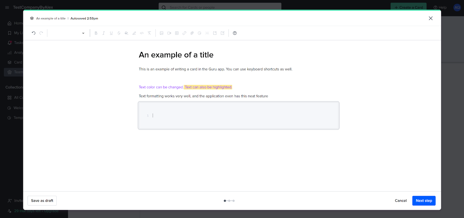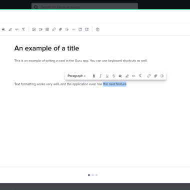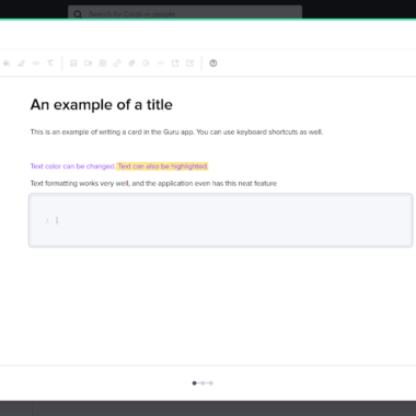 Altre funzionalità includono i classici, come gli allegati e i media – immagini, video, link e pezzi di codice. Puoi anche andare più a fondo e personalizzare i tuoi articoli con marcature, colori del testo, iframe, evidenziazioni, elenchi e altro ancora. Nel complesso, le opzioni sono molto buone e offrono grandi possibilità di personalizzazione. Se decidi di usare Guru, non dovresti avere problemi a creare articoli interessanti e ricchi di informazioni.