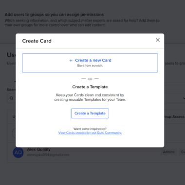 Una volta cliccato sull’opzione “Crea una scheda” nell’angolo in alto a destra, avrai due opzioni per iniziare a scrivere il tuo primo articolo. Puoi iniziare a scrivere una nuova scheda completamente da zero o creare un modello. C’è anche la possibilità di trovare ispirazione per la creazione di schede o modelli visitando la community di Guru. Ho testato entrambe le opzioni – creazione di una nuova scheda e creazione di un modello – e funzionano più o meno allo stesso modo, con alcune piccole differenze.
