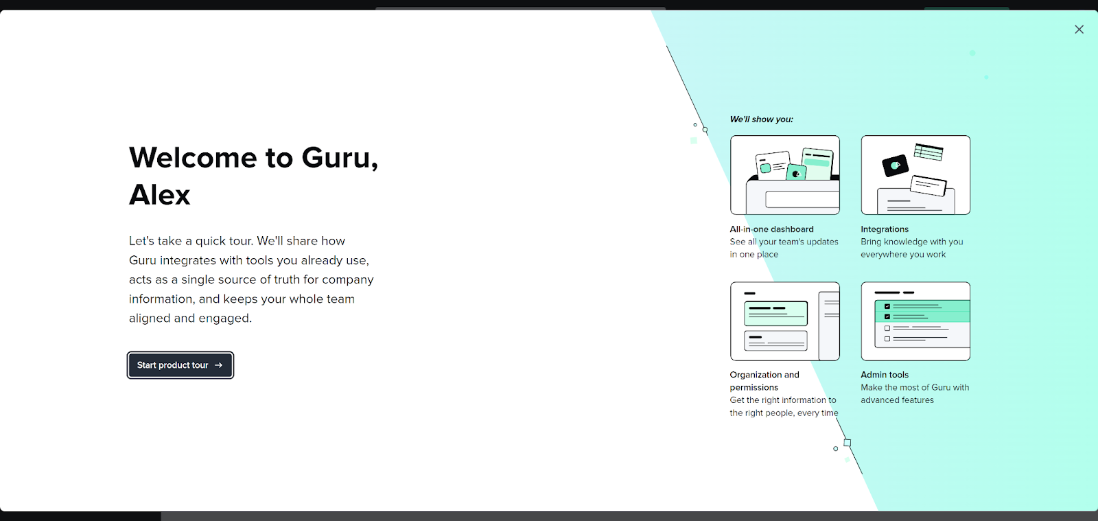 Una volta terminati tutti i passaggi, puoi iniziare il tour del prodotto o saltare completamente questa fase. La guida è piuttosto ben fatta e mostra la nuova dashboard, le integrazioni di Guru e alcune altre cose per aiutarti a iniziare. Una volta terminata, puoi iniziare a dare un’occhiata all’interfaccia utente, che è progettata altrettanto bene quanto la guida “Iniziamo“. Guru fornisce utili tooltip in tutta l’interfaccia. Puoi fare clic su di essi vuoi saperne di più su delle funzionalità specifiche.