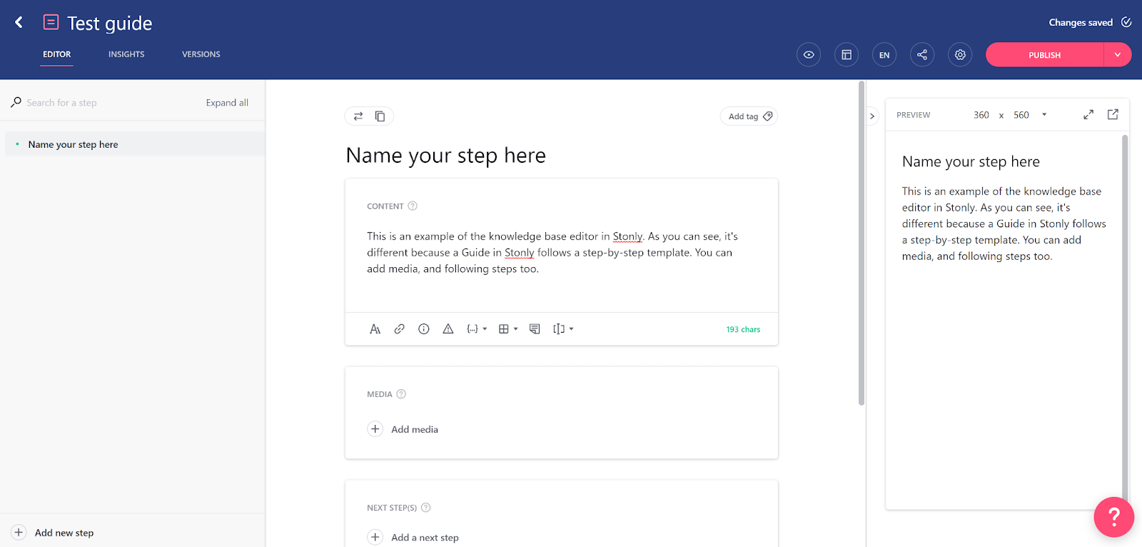 Indipendentemente dalla scelta, l’esperienza sarà senza dubbio molto fluida. Ho scelto il modello “Guida” e devo dire che l’interfaccia è molto precisa. Questo modello di guida tratta il testo come una guida passo-passo, quindi è possibile riempire ogni passaggio e aggiungere dei media rilevanti – immagini, video, codici o un’icona preimpostata. È inoltre possibile modificare il layout in tre diverse varianti, vedere un’anteprima, condividere la guida e cambiare le impostazioni per ogni guida. L’editor offre tutte le funzionalità standard di formattazione del testo, oltre a impostazioni aggiuntive. Nel complesso, l’editor è piuttosto standard e offre ciò che ci si aspetta.