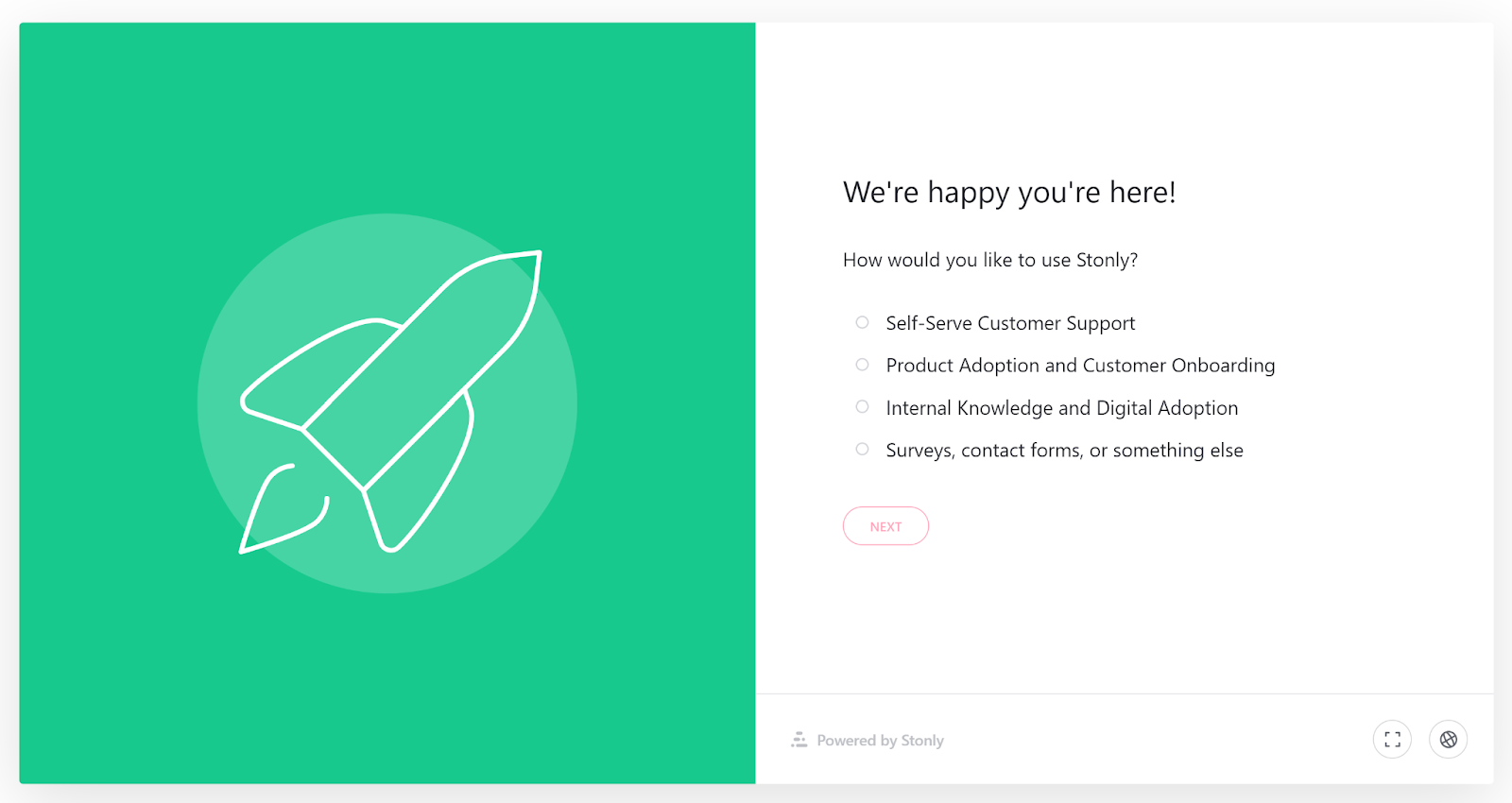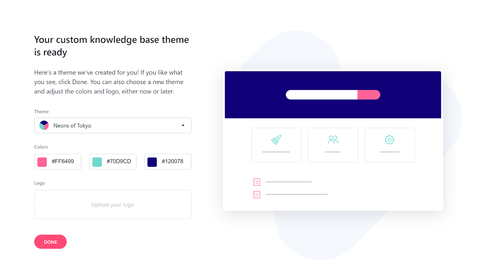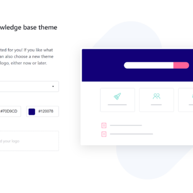 Per iniziare a lavorare con Stonly è sufficiente creare un account. Puoi anche optare per una prova gratuita per vedere se ti piace. Non sono richiesti dati della carta di credito e si riceve un’introduzione semplice ma efficace su come funziona Stonly e su ciò che occorre fare per iniziare. L’introduzione funziona come un questionario e mira a scoprire come si desidera utilizzare Stonly. Se scegli l’opzione della base di conoscenza, Stonly ti porterà automaticamente al primo passo per la sua creazione e inizierai con la scelta della combinazione di colori del modello. Sono disponibili alcune opzioni di bell’aspetto e puoi anche aggiungere subito il tuo logo.