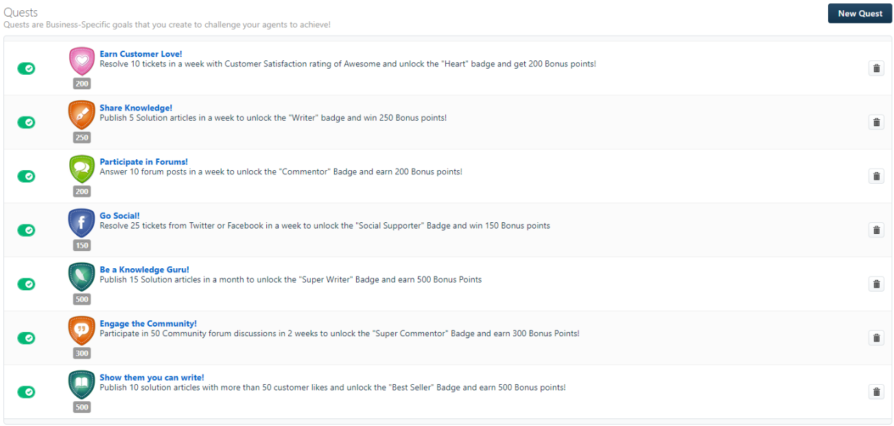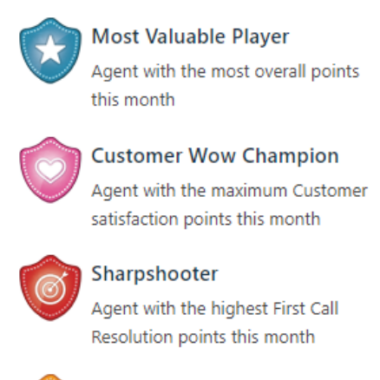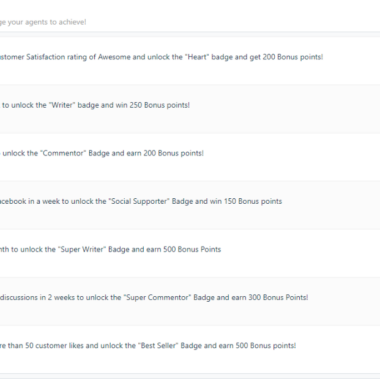 Con le missioni, puoi stabilire obiettivi di performance per i tuoi agenti di assistenza e allinearli con gli obiettivi aziendali. Queste missioni spingeranno i tuoi agenti a svolgere attività a vantaggio del tuo marchio e a portare le loro capacità di assistenza clienti a un livello superiore. Ma non è tutto! Completando le missioni, i tuoi agenti possono guadagnare punti bonus e badge unici che verranno visualizzati sui loro profili, mostrando i loro risultati. Inoltre, il completamento delle missioni aumenterà le loro possibilità di vincere trofei mensili e di raggiungere nuove vette nella classifica degli agenti.