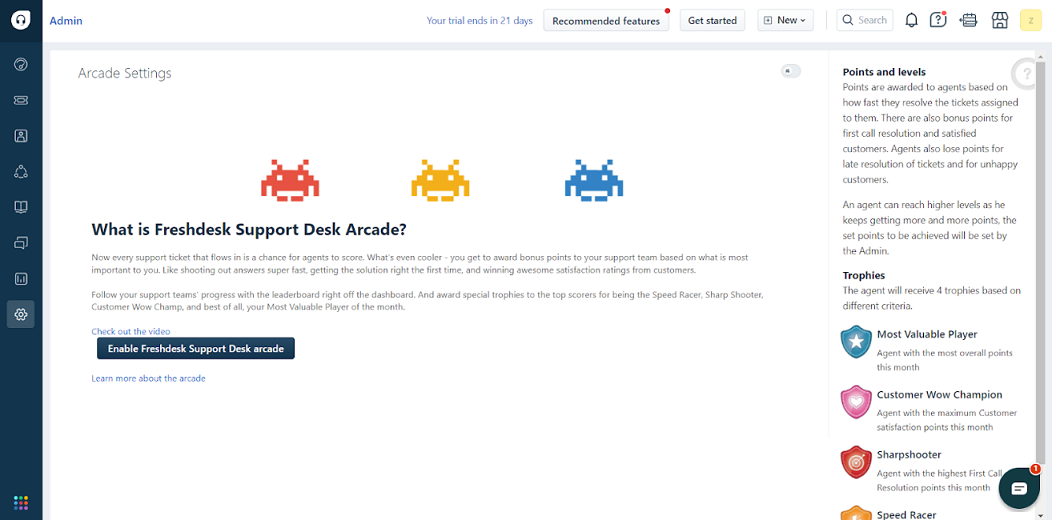 Una volta fatto questo, il passo successivo è quello di abilitare il Freshdesk Support Desk Arcade nelle impostazioni e il vero divertimento può iniziare.