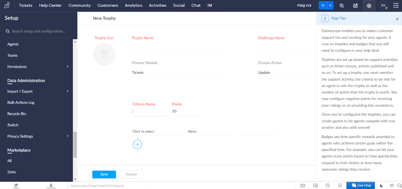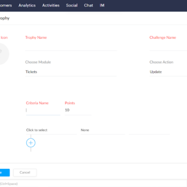 Le sfide sono un’altra funzionalità inclusa nella gamification di Zoho Desk. Gli amministratori possono creare sfide che gli agenti devono completare, come ad esempio risolvere un certo numero di ticket entro un determinato periodo di tempo. Il completamento delle sfide fa guadagnare punti agli agenti, aiutandoli a ottenere nuovi trofei.