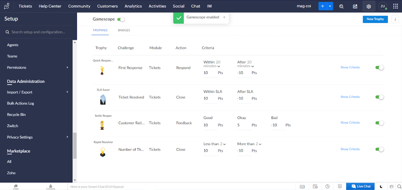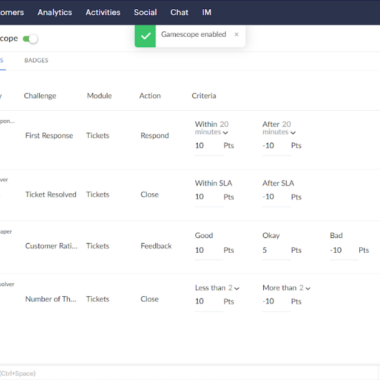 Una volta terminata l’impostazione di tutte le regole di gamification, Zoho Desk ha iniziato automaticamente a tracciare i dati richiesti in base ai criteri che avevo salvato.