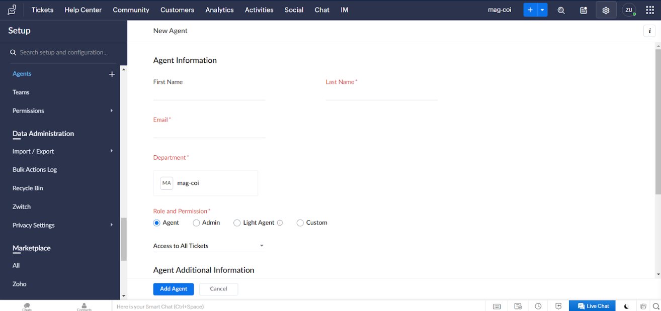 Entusiasta di testare il software, sono andato avanti e ho aggiunto tutti gli agenti di prova per esaminare correttamente le funzionalità di gamification da entrambi i lati. Per aggiungere gli agenti, mi è stato chiesto di fornire una serie di informazioni. Tra queste, il nome e il cognome, l’indirizzo e-mail e il reparto di appartenenza. Ho anche assegnato loro i ruoli e i permessi giusti. Ci sono altre impostazioni che si possono configurare per gli agenti, se si vuole essere accurati, ma ho scelto di saltarle perché non erano così importanti per la funzionalità di gamification.