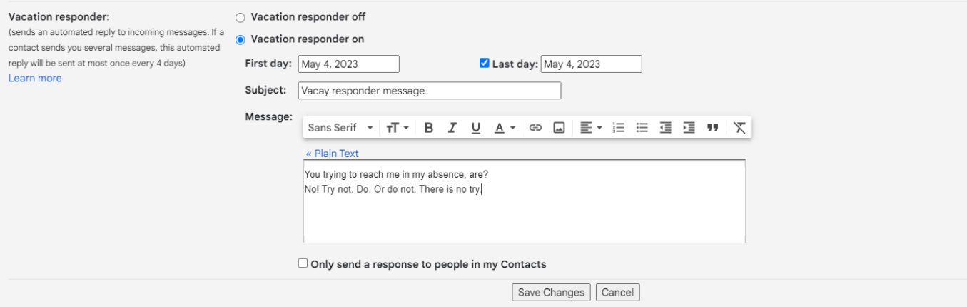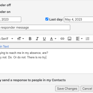 Prima di tutto, ho individuato un risponditore per le vacanze. Naturalmente, l’invio di messaggi automatici in tua assenza per avvisare le persone della tua indisponibilità è fondamentale, quindi ne ho configurato uno.