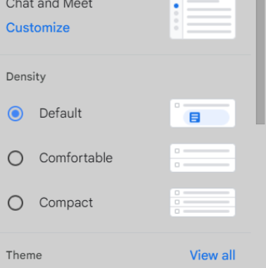Prima di tutto, come molti altri, sono passato immediatamente alla modalità scura selezionando un Tema. Puoi farlo nel menu a discesa delle impostazioni, oppure puoi fare clic su Vedi tutte le impostazioni e scegliere un tema lì. Sebbene Gmail offrisse molte combinazioni di colori e temi carini, ho scelto il semplice tema scuro, che è così vicino e caro al cuore di molte persone.