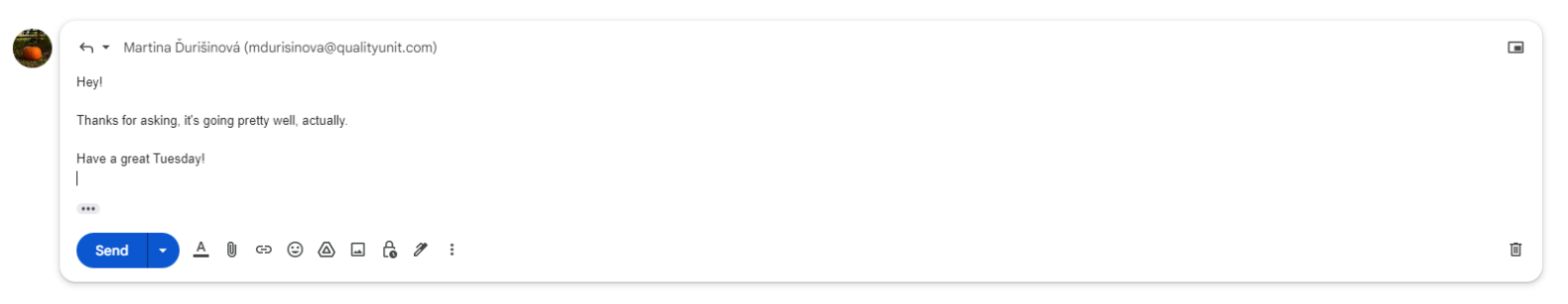 Rispondere a un’e-mail è molto semplice. È sufficiente digitare il messaggio e premere il pulsante Invia. Se vuoi allegare file dal tuo computer o da Google Drive, firmare il tuo messaggio o attivare la già citata modalità riservata, puoi farlo direttamente dall’editor del messaggio.