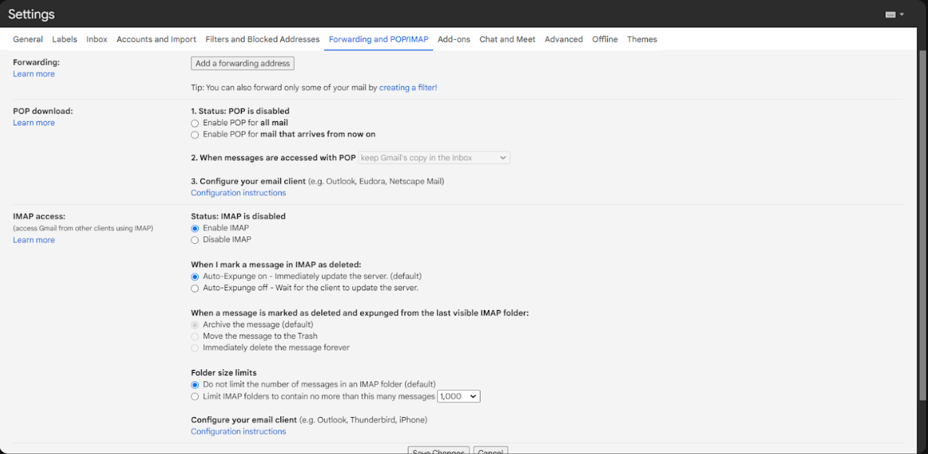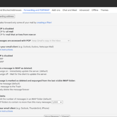 Per configurarlo, vai su Impostazioni e seleziona la scheda Inoltro e POP/IMAP. Puoi aggiungere uno o più indirizzi di inoltro e garantire l’accesso al proprio account Gmail da altri client che utilizzano IMAP.