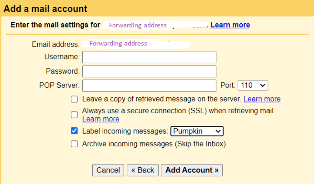 Per aggiungere un indirizzo e-mail di inoltro, clicca sul pulsante Aggiungi un indirizzo di inoltro. Si aprirà una finestra pop-up in cui dovrai inserire l’indirizzo di inoltro, la password, il server POP e la porta, oltre ad aggiungere altre configurazioni. Al termine, clicca su Aggiungi Account.
