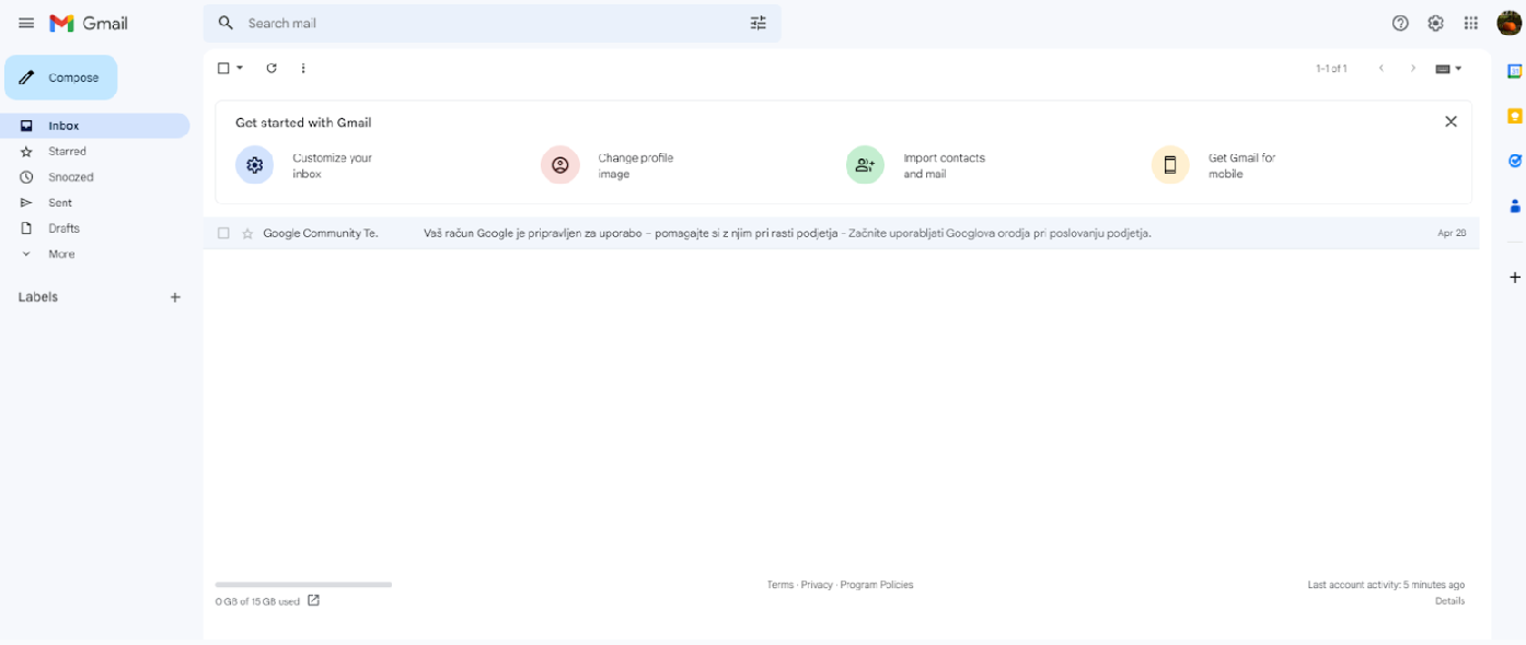 Sono stato accolto da un layout standard della casella di posta. La Google Community mi ha dato il benvenuto con un messaggio contenente alcuni suggerimenti e passi aggiuntivi da compiere per personalizzare il mio account appena creato.