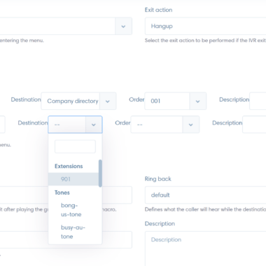 Il builder funziona come la maggior parte dei software IVR correlati. La prima parte consente di dare un nome all’IVR, di selezionare il messaggio di saluto e un’azione di uscita. Successivamente è possibile selezionare un’azione per ogni pulsante dell’IVR. Le opzioni di azione sono un po’ insolite, ad esempio è possibile selezionare Segreteria Telefonica, Riagganciare la Chiamata o Registrare come azione da eseguire dopo aver premuto un tasto scelto. Tuttavia, è disponibile anche l’opzione standard di instradare la chiamata a un numero interno, che probabilmente è quella che si utilizzerà di più.