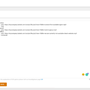 L’impostazione dell’IVR di LiveAgent è un po’ insolita all’inizio. Non offre una rappresentazione visiva dei livelli dell’IVR, quindi è necessario pianificare tutto in anticipo. L’impostazione e la configurazione dell’IVR devono essere eseguite con uno script YAML. Se è la prima volta che lo utilizzi, non preoccuparti – c’è una guida disponibile e puoi trovare il link direttamente nelle impostazioni IVR di LiveAgent. Se vuoi evitare di scrivere da solo l’intero IVR, puoi scegliere un esempio di IVR qui, copiarlo e personalizzarlo a tuo piacimento.