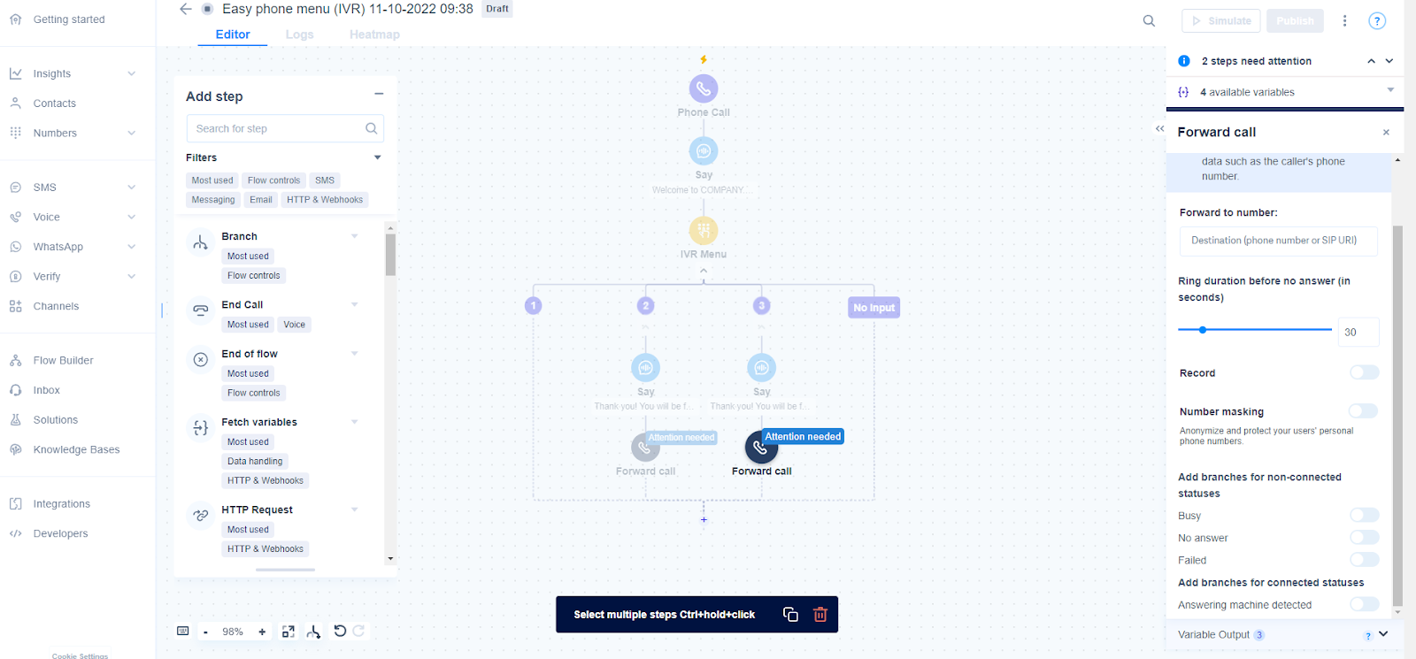 Devi ricontrollare il design del flusso dell’IVR e correggere gli errori che individui. Per ulteriore assistenza sull’IVR, puoi consultare la sezione di assistenza di Messagebirds o contattare il servizio clienti.