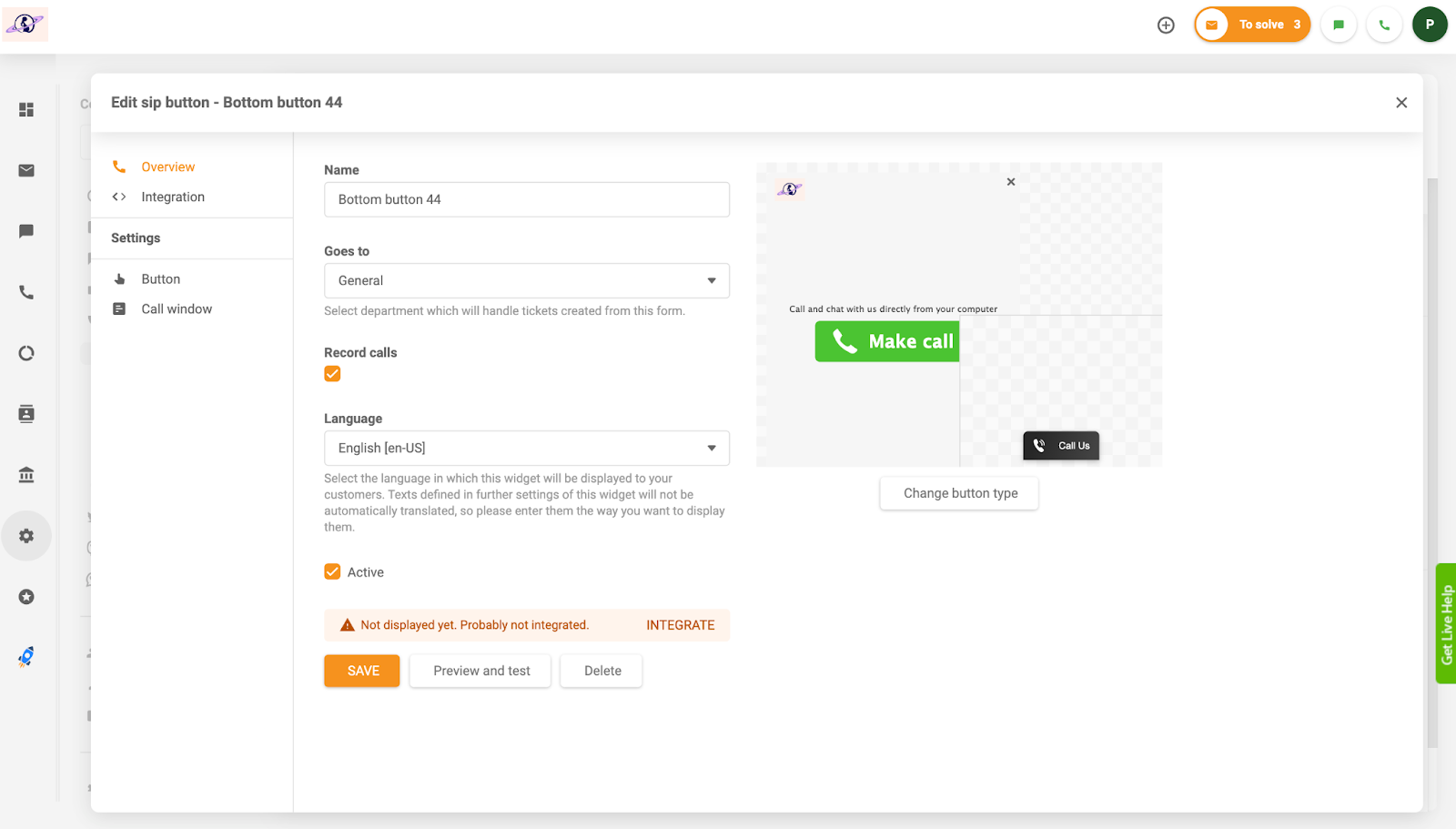 Vai a Configurazione>Chiamata>Pulsanti e seleziona il pulsante desiderato o creane uno personalizzato. Vai alla scheda Integrazione e copia il codice html. Puoi incollarlo facilmente sul tuo sito web o nella sezione Prima dei codici di tracciamento nella base di conoscenza di LiveAgent.