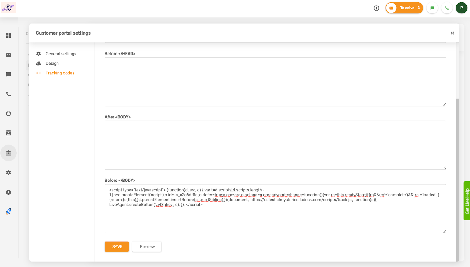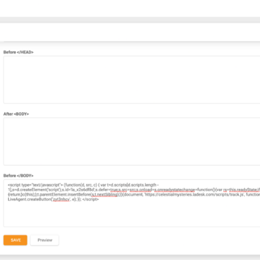Quando ho selezionato “Integra” nelle parole rosse, sono stato portato direttamente alla copia del codice html. Sono andato alla base di conoscenza utilizzando la dashboard (proprio sopra il pulsante delle impostazioni nelle schede di sinistra), poiché è lì che ho deciso di testare il mio pulsante. Sono andato in Impostazioni della Base di conoscenza > Configurazione generale > Codici di tracciamento e ho incollato il mio codice html nella sezione. Questo codice può anche essere facilmente copiato e incollato su qualsiasi sito web.