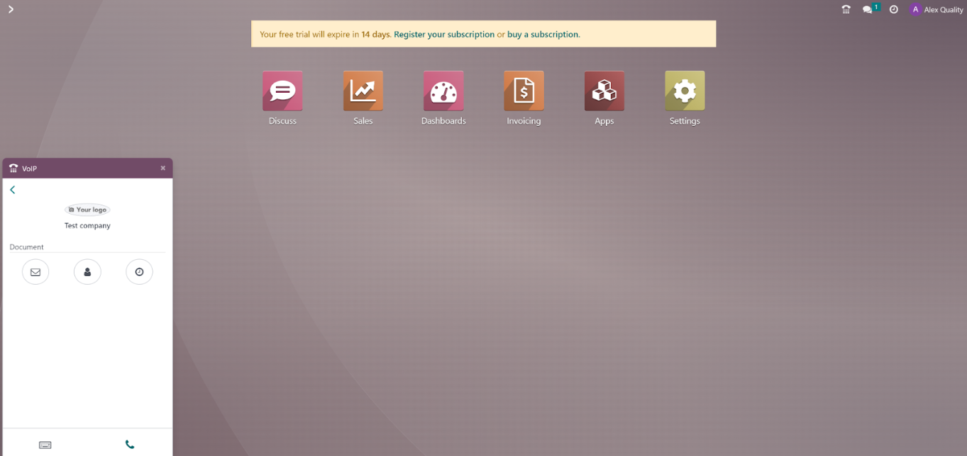 Dopo averlo fatto, si trova l’icona del telefono nell’angolo in alto a destra. Facendo clic su di essa, Odoo aprirà un widget di composizione separato con opzioni per vedere le chiamate precedenti, accedere ai contatti e un’opzione chiamata “prossime attività”. Tuttavia, questa funzionalità di Odoo non viene fornita con un numero di telefono, quindi è necessario integrare il proprio tramite un servizio VoIP, il che avrà sicuramente un costo. È possibile accedere alle impostazioni di Odoo VoIP tramite l’opzione impostazioni generali e impostare la funzionalità di chiamata. Odoo offre anche un paio di guide online che spiegano il processo.