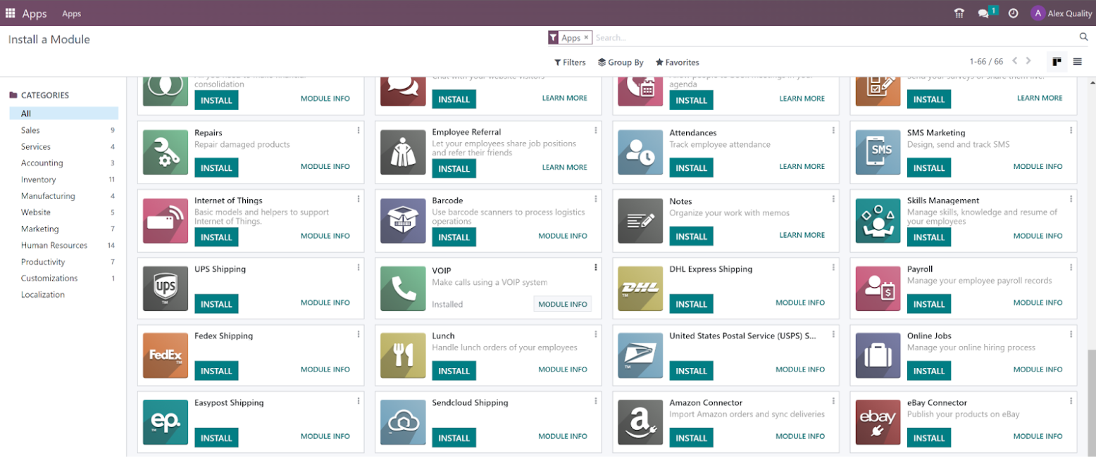 Dopo l’accesso all’interfaccia, se vuoi la funzionalità VoIP nel tuo account Odoo, devi andare dritto alla sezione Applicazioni. Ho scoperto che questa applicazione non si trova nell’opzione Vendite, ma piuttosto in Produttività, quindi ti consiglio di scegliere questa opzione durante la registrazione per evitare l’opzione di prova gratuita. L’installazione di questo modulo è molto semplice, basta fare clic sul pulsante di installazione e l’applicazione verrà aggiunta alle funzionalità di Odoo.
