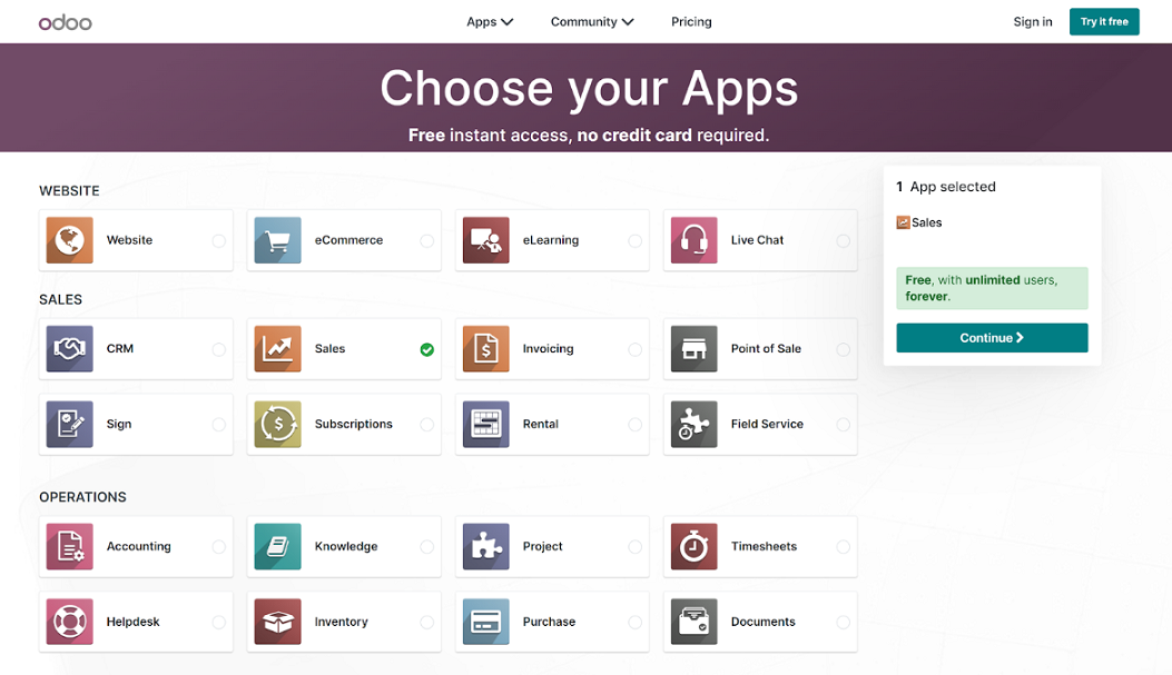 Il piano Free consente di accedere gratuitamente a una delle numerose applicazioni offerte da Odoo. Se decidi di acquistare un’altra applicazione, Odoo ti offrirà una prova gratuita per le applicazioni selezionate.