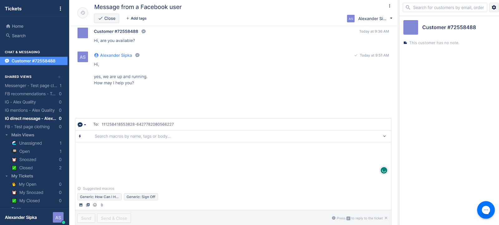 La prima cosa che ho provato è stata l’invio di un messaggio tramite Messenger e sono lieto di dire che è stato consegnato al sistema di ticketing immediatamente, in un solo secondo. Le risposte funzionano molto bene e si possono utilizzare funzionalità come allegati, emoji o inviare video e immagini. Ho apprezzato il fatto che la casella di risposta offra anche suggerimenti di macro per aiutare a rispondere più velocemente.