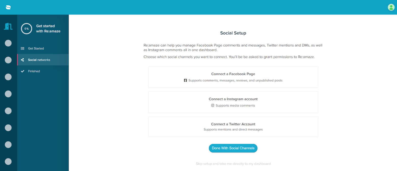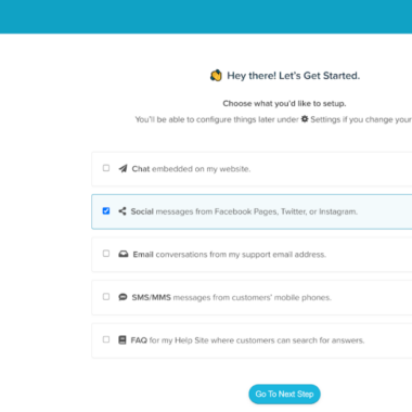 Re:amaze ti permette di iniziare con una prova gratuita, in modo da non dover scegliere subito un piano. Una volta inseriti i tuoi dati nel modulo di registrazione, Re:amaze ti aiuterà a configurare ciò di cui hai bisogno. Mi ha dato la possibilità di impostare chat, e-mail, SMS/MMS, FAQ o social media. Ho scelto l’opzione dei social media, poiché è quella su cui ci concentreremo in questa recensione. C’è anche la possibilità di saltare completamente questa parte della configurazione.