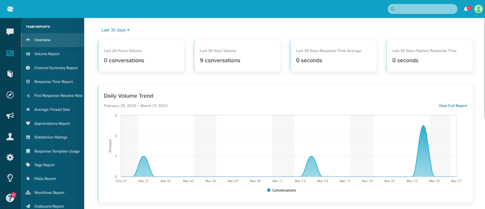 Oltre alle funzionalità di ticketing per i social media, puoi contare anche su altri elementi. Una di queste è rappresentata dalle funzionalità di automazione, che includono modelli di risposta, flussi di lavoro, funzionalità di customer intent e una varietà di bot. Re:amaze offre anche funzionalità di reporting per le conversazioni e i messaggi, oltre a flussi di lavoro, tag e prestazioni del personale. Questi ultimi tre aspetti sono disponibili solo nei piani più costosi.