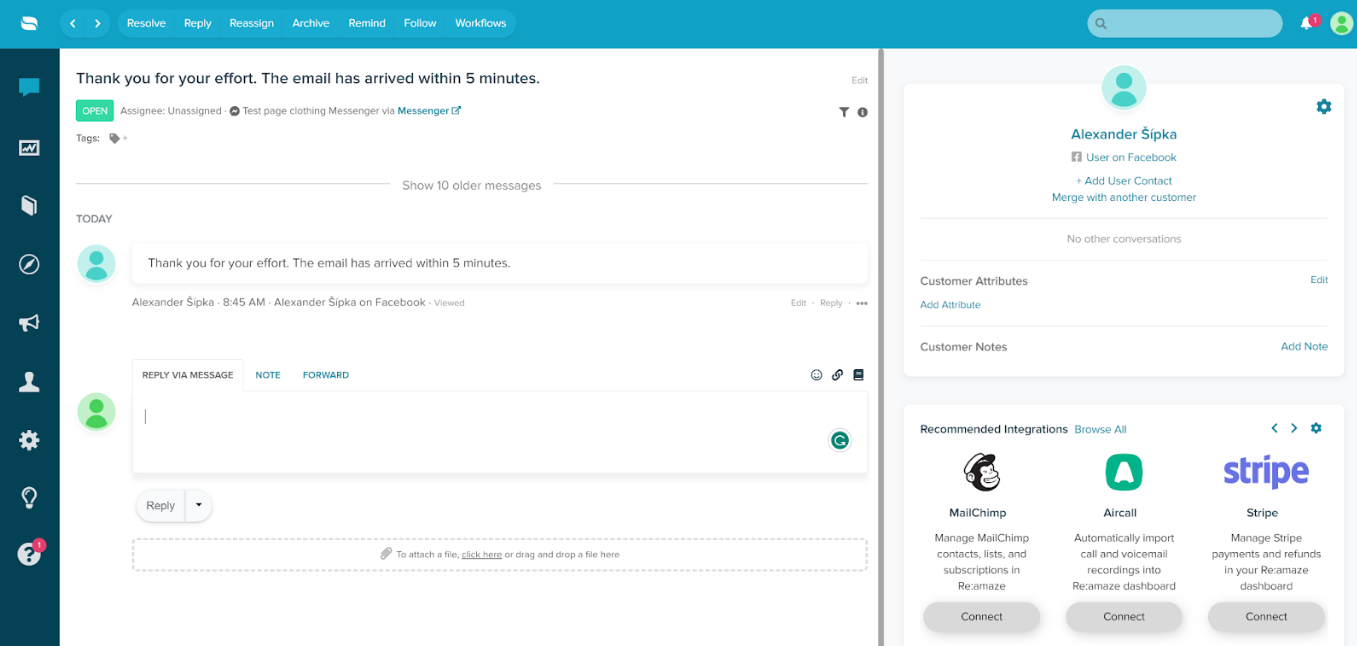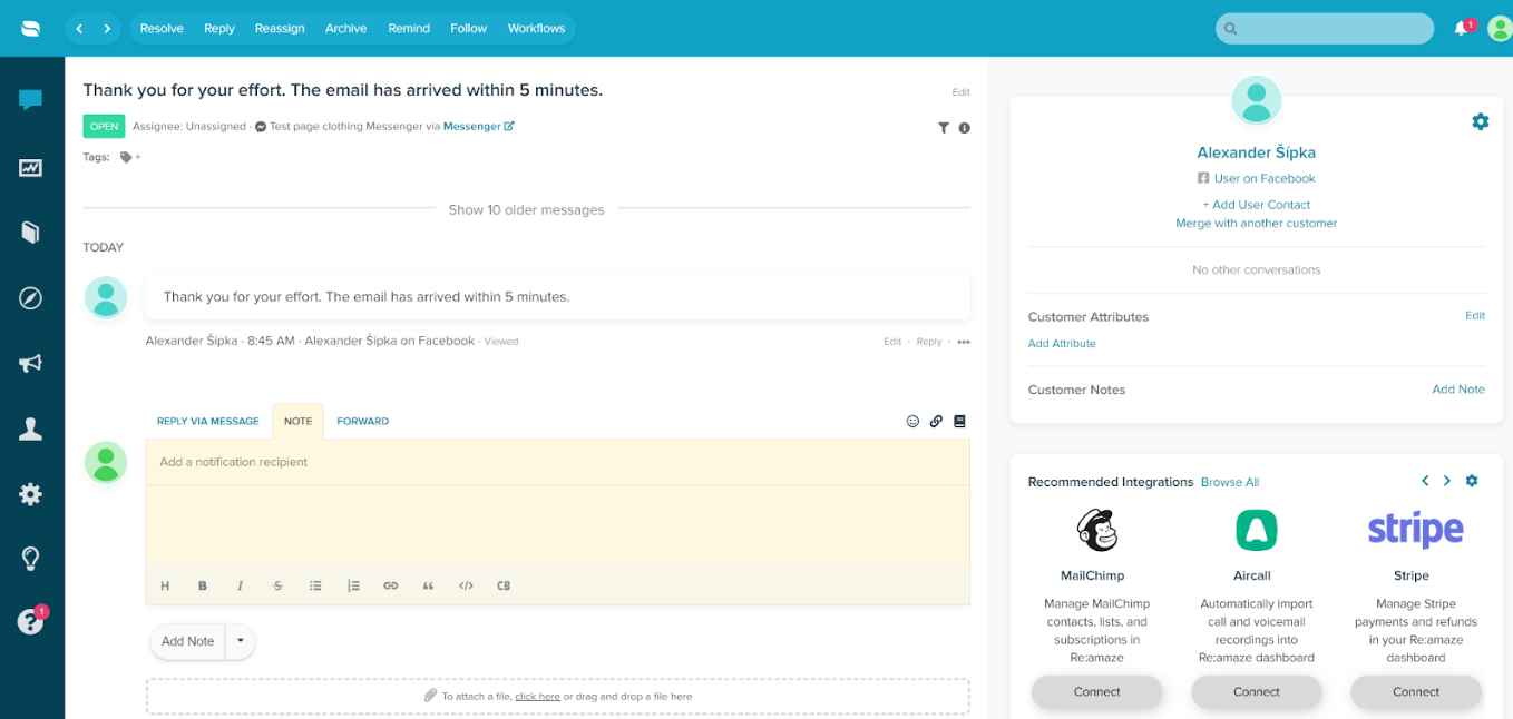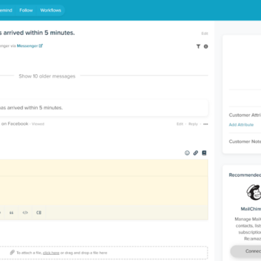 All’inizio, lavorare con Re:amaze sembra un’impresa ardua. È un sistema dall’aspetto fantastico che sembra fare tutto alla perfezione. Il primo problema che ho notato è che non ho ricevuto alcuna notifica di un messaggio Messenger in arrivo. Ho dovuto aggiornare il sistema e cercare manualmente le notifiche nella casella di posta. Una volta trovata, le cose sono migliorate di nuovo con l’interfaccia all’interno del ticket. In seguito ho scoperto che è necessario attivare le notifiche manualmente, il che sembra una scelta strana. A mio parere, questa funzionalità dovrebbe funzionare già dall’inizio.