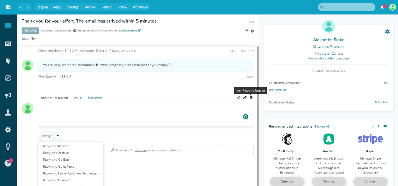 La funzionalità rimane la stessa per tutti i ticket, indipendentemente dal fatto che provengano da Facebook, Instagram o Twitter. Questo è un aspetto positivo da un lato, perché elimina ogni confusione nelle risposte e permette di abituarsi allo stesso flusso di lavoro per ogni ticket sui social media, indipendentemente dalla sua origine. D’altra parte, sembra che Re:amaze dimentichi che ogni social network offre una serie di funzionalità diverse, che potrebbero essere sfruttate al meglio se inserite nel sistema di social media ticketing di Re:amaze.