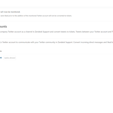 Dopo un paio di giorni, ho deciso di fare un altro tentativo. L’integrazione con Facebook ha funzionato e mi ci sono voluti solo un paio di secondi per completarla. Non so cosa abbia magicamente risolto il problema che avevo, ma sospetto che sia semplicemente legato alla cache del browser. Sono riuscito a integrare anche il mio account Twitter di prova e ho impiegato solo un minuto per completare il processo. A questo punto ero pronto per iniziare a testare la funzionalità di assistenza clienti sui social media di Zendesk. Prima di passare al test vero e proprio, diamo un’occhiata ad alcune funzionalità relative ai social media in Zendesk.