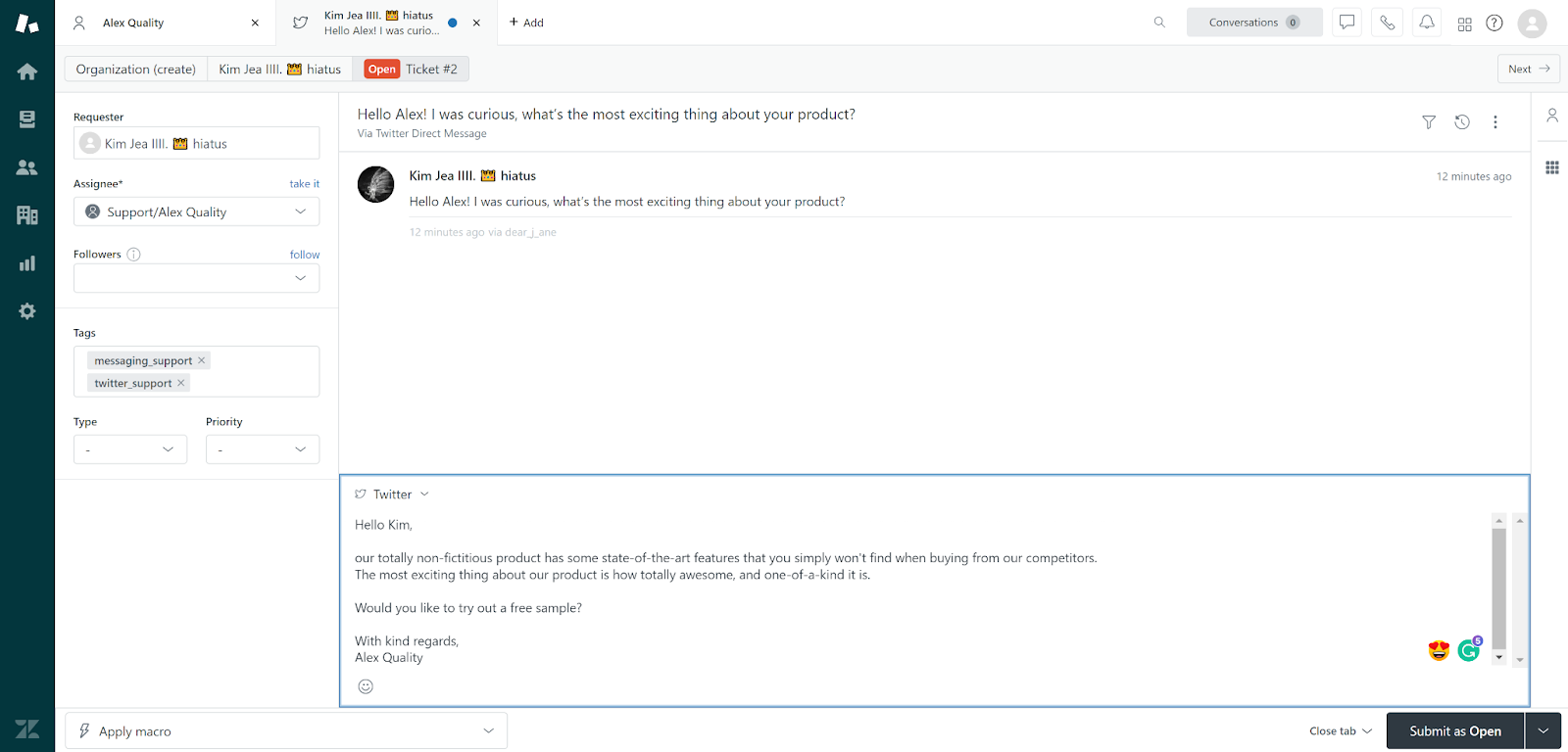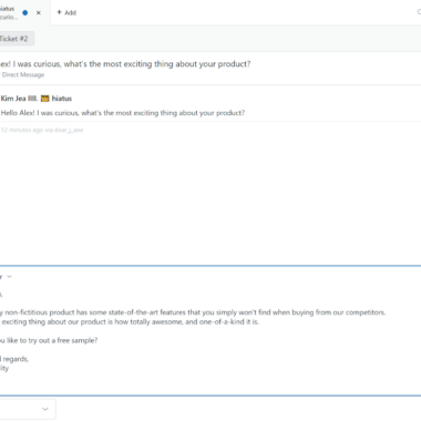 Il sistema di ticketing ha trattato il messaggio di Twitter come un altro ticket ed è stato un piacere vederlo nella casella di posta universale. Ciò che mi ha un po’ sorpreso è che non avevo la possibilità di utilizzare le funzionalità di allegato, anche se la messaggistica su Twitter supporta l’invio di immagini e GIF. Tuttavia, le risposte hanno funzionato abbastanza bene e anche se l’integrazione non è perfetta, non dovrebbe causare altri problemi importanti. Le menzioni nei tweet funzionano molto bene e tutte vengono visualizzate nel sistema di ticketing entro un minuto.