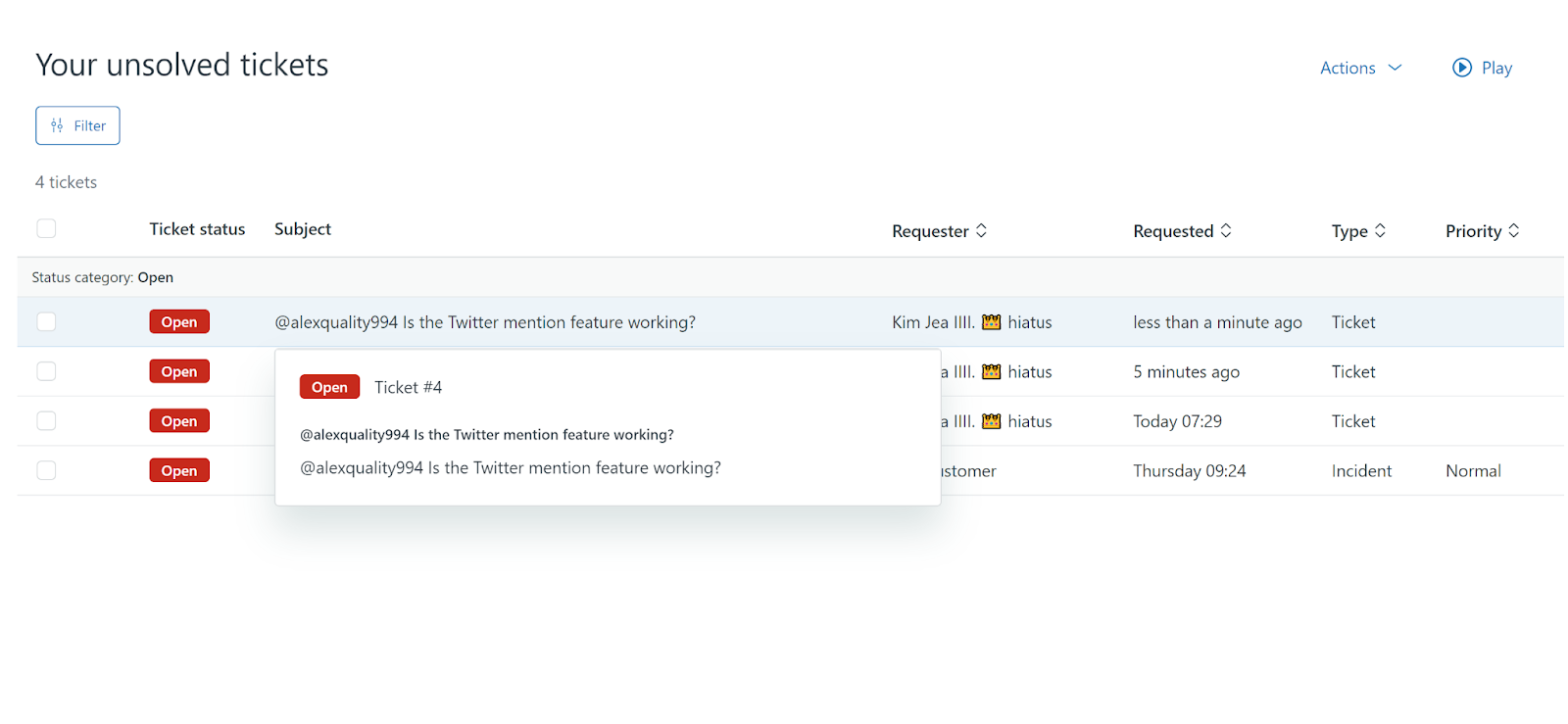 Dopo aver integrato con semi-successo i miei account Facebook e Twitter con Zendesk, è arrivato il momento di testare questi canali e di fare un’esperienza diretta di lavoro. Sono stato in grado di simulare un caso d’uso standard con l’aiuto del mio caro collega su Twitter, oltre a messaggiare io stesso su Facebook con un altro account. Diamo prima un’occhiata ai ticket di Twitter.