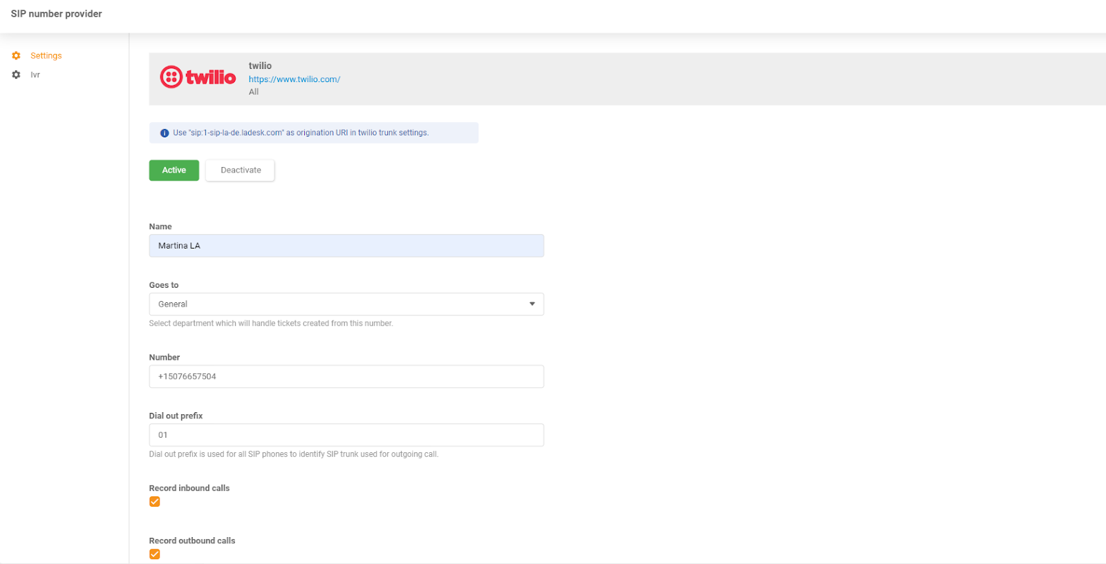 Avevo il mio account Twilio, quindi l’ho integrato. Se non hai ancora configurato il tuo provider VoIP, la base di conoscenza di LiveAgent offre un utile articolo che ti guida attraverso il processo.