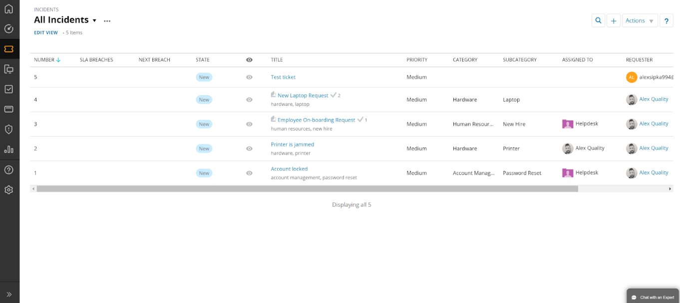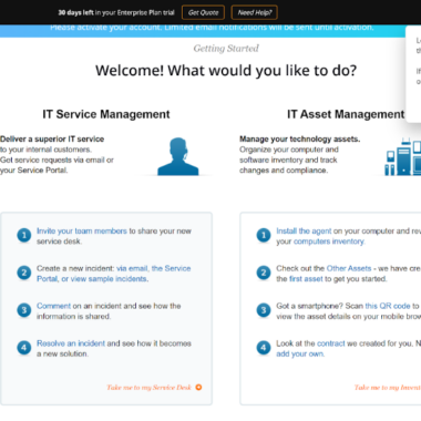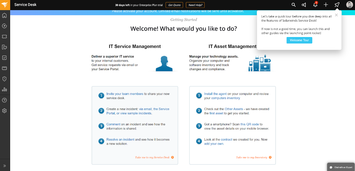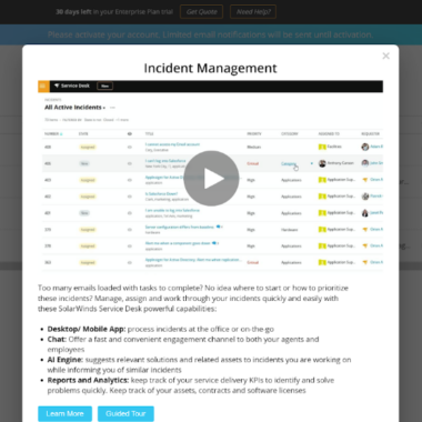 Facendo clic su “Portami al mio service desk”, accedi alla dashboard di gestione degli incidenti, che è il sistema di ticketing di SolarWinds. L’applicazione web ti fornirà una rapida introduzione alla gestione degli incidenti e ti darà la possibilità di fare un tour completo o di guardare il video introduttivo. Se vuoi ignorare queste opzioni, ti basterà chiudere la finestra e continuare con il sistema di gestione dei ticket.