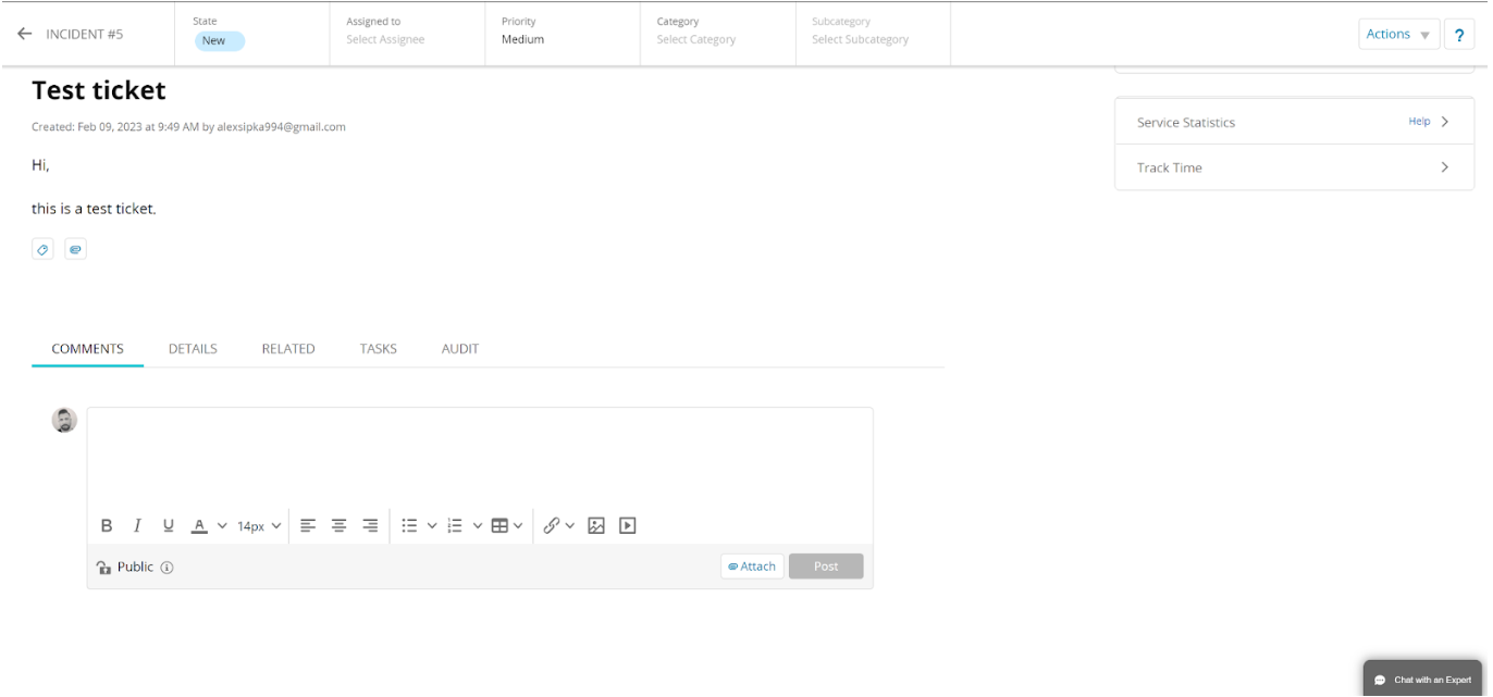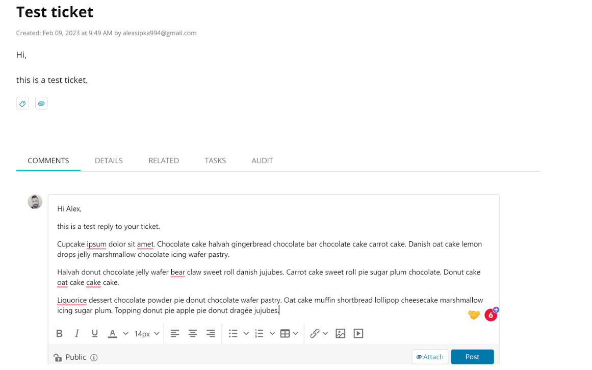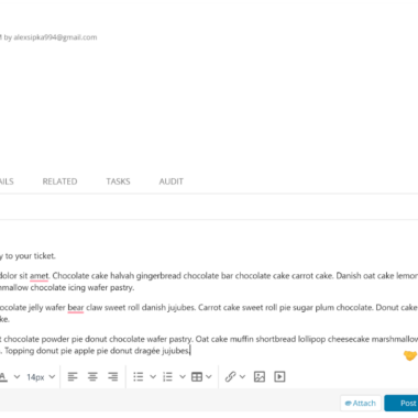Sebbene il campo per la risposta possa sembrare piuttosto compatto, si allunga di conseguenza quando il testo raggiunge la lunghezza appropriata. Ciò è utile per risparmiare spazio sullo schermo. Nel campo di risposta è possibile accedere a tutti gli strumenti di modifica del testo. Inoltre, nel ticket sono presenti altre opzioni: dettagli del ticket, elementi correlati, attività e registro di controllo. Tutte queste opzioni hanno un buon utilizzo in vari scenari.