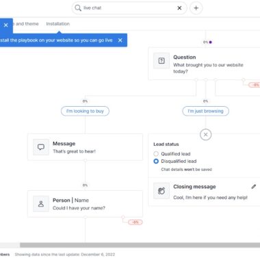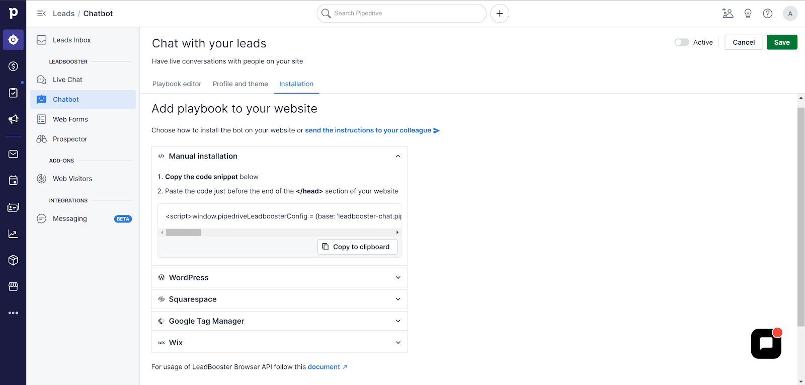 Sebbene possa dire onestamente che le funzionalità del flusso di PipeDrive sono molto ben progettate, è un peccato che l’applicazione costringa essenzialmente a usare un chatbot. Il chatbot di PipeDrive verrà analizzato in una recensione separata, quindi concentriamoci sull’implementazione della live chat di PipeDrive. Una volta soddisfatti del design del flusso, puoi selezionare la scheda Installazione e scegliere tra varie opzioni, tra cui WordPress, Squarespace, Google Tag Manager, Wix o l’installazione manuale. Ai fini di questa recensione ho scelto l’installazione manuale.